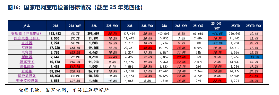 一次设备:25年第四批招标正在进行,变压器/组合电器/电抗器/互感器/电容器/断路器/隔离开关/消弧线圈/开关柜需求同比分别为-17%/ 16%/-13%/ 10%/18%/9%/7%/15%/15%,需求整体来看保持了稳健增长,变压器和电抗器高压及超高压需求有所减弱,但我们认为主要系批次间需求波动 去年同期高基数影响,全年招标需求预期保持稳健增长。