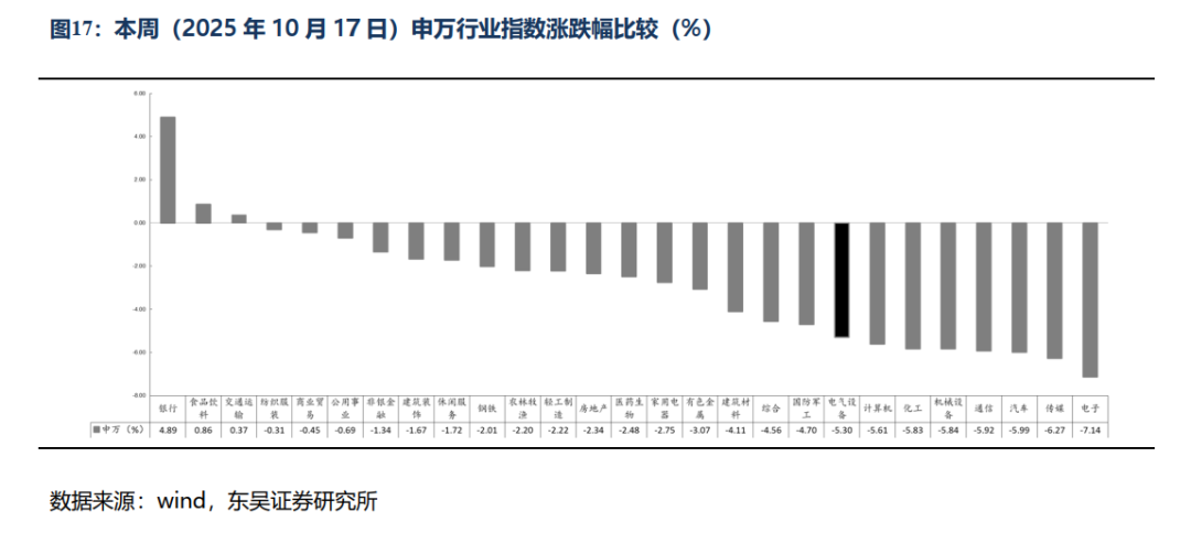 电气设备9435下跌5.3%,表现弱于大盘。光伏涨0.52%,核电跌5.15%,锂电池跌5.19%,电气设备跌5.3%,新能源汽车跌5.72%,风电跌8.9%,发电设备跌9.23%。涨幅前五为向日葵、四方股份、石大胜华、和顺电气、天际股份;跌幅前五为广大特材、嘉泽新能、新宏泰、百利电气、智慧能源。