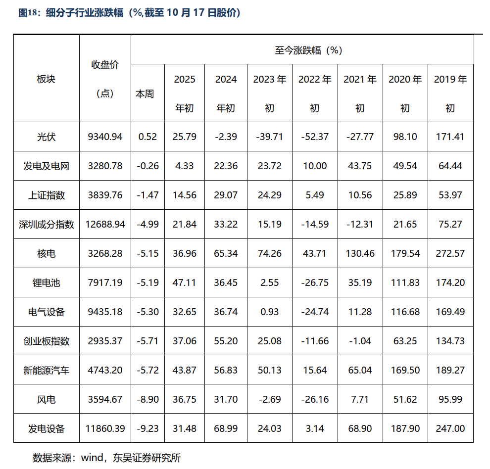 投资策略:储能:国内容量补偿电价逐步出台,大储需求超预期,供应紧张,今明年预计30-40%增长,美国大美丽法案后今年抢装超预期,预计明后年稳增长,欧洲、中东等新兴市场大储需求大爆发,持续高增长;欧洲户储去库完成,出货恢复,工商储需求开始爆发,新兴市场光储平价需求持续,我们预计全球储能装机25-28年的CAGR为30-50%,继续强推大储,看好大储集成和储能电池龙头。锂电&固态:9月销量160万,同环比 25%/15%,全年预计增长30%,26年预计15% 增长;欧洲9月主流9国电动车销量合计31万辆,同环比35%/76%,累计增30%,上修全年增长至30-35%;同时9月储能装机及招标继续亮眼,电池供不应求,10月排产进一步提升10%,旺季再上台阶,且各家指引高景气度延续,其中,储能需求超预期,价格已上涨1-3分/wh,预计Q4价格仍有提升空间,材料方面,6F和铁锂涨价确定性强,其余材料26年涨价有望跟进,短期受出口管制错杀,实质影响极小,回调即买点,继续全面看好锂电池板块,首推宁德、亿纬锂能、欣旺达等。同时材料环节一二线厂商产能已打满,涨价诉求强烈,6F和高压密铁锂涨价可能性高,预计26年有望开始盈利有望修复,看好科达利、璞泰来、天赐等锂电龙头公司,同时固态中试线2H25密集落地,继续强推硫化物固态电解质和硫化锂及核心设备优质标的。机器人:英伟达近期加码人形本体和大模型,Tesla Gen3将于10-11月定型,股东大会有望展示,25Q4下订单、26年初量产,2030年依然预期100万台;人形公司产品、订单、资本端等进展提速,25-26年国内外量产元年共振,我们继续全面看好人形板块,全面看好T链确定性供应商和头部人形核心供应链、看好总成、灵巧手、丝杠、谐波、传感器、运控等核心环节。AIDC:海外算力升级对AIDC要求持续提升,高压、直流、高功率趋势明显,国内相关公司迎来出海新机遇,继续看好有技术和海外渠道优势的龙头;工控:工控25年需求总体继续弱复苏,锂电需求恢复、风电、机床等向好,同时布局机器人第二增长曲线,全面看好工控龙头。风电:25年国内海风10GW ,翻倍增长,Q2是拐点,欧洲海风进入持续景气周期,继续全面看好海风,陆风100GW ,同增25%,铸件等零部件涨价,风机毛利率逐步修复,推荐海缆、海桩、整机等。光伏:三季度国内终端需求支撑偏弱,排产端暂时小幅下降,政策引导光伏反内卷力度强,硅料成为主要抓手,当前价格50元/kg ,硅片和电池顺价,组件待观察终端需求;今明年全球光伏装机增速为15%/5%,欧洲分布式和新兴市场持续需求好,看好受益的逆变器环节、看好反内卷受益的硅料、玻璃、电池和组件等。电网:25年电网投资增长,出海变压器高景气,看好Alpha龙头公司思源等。