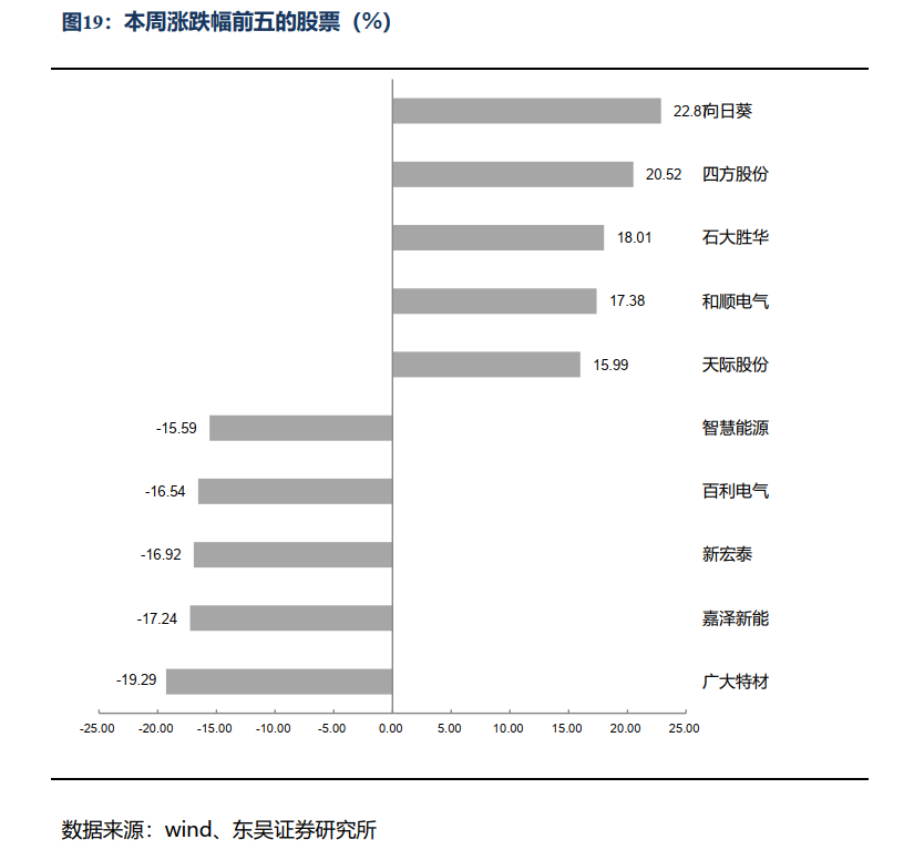 涨幅前五为向日葵、四方股份、石大胜华、和顺电气、天际股份;跌幅前五为广大特材、嘉泽新能、新宏泰、百利电气、智慧能源。