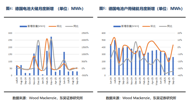 9月德国大储装机28.7MWh,同比 61.24%,环比-5.59%;配储时长增长至2.4小时。1-9月大储累计装机775MWh,同比 87.88%。我们预计25年德国大储有望翻番增长至1.5GWh。