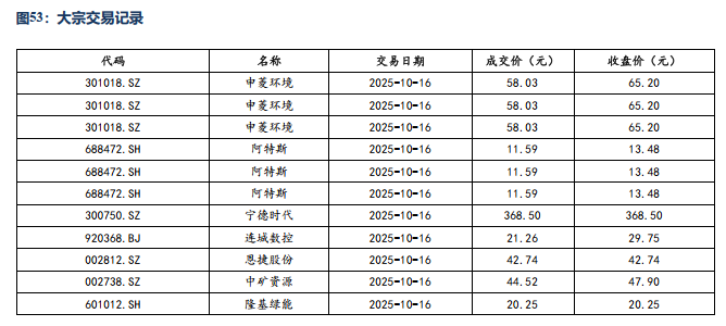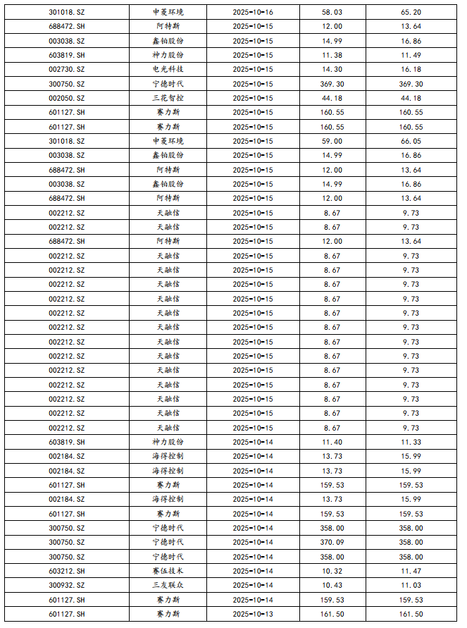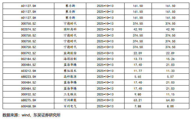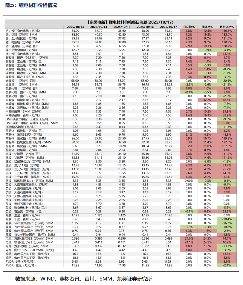 行业层面:人形机器人:具身触觉企业千觉机器人完成亿元Pre-A轮融资,11.6亿定增启动,均普智能加码具身智能机器人产业化布局,江苏省具身智能机器人标准化技术委员会获批成立,智元发布新一代工业级交互式具身作业机器人精灵G2,优必选再获大单 与知名汽车公司达成人形机器人采购协议,小米登记第三代人形机器人CyberOne作品著作权,杭州率先立法护航具身智能机器人产业,科沃斯战投领投,国内一体化关节领先创企完成近亿元A轮融资。储能:25年9月国内新型储能新增装机3.08GW/9.17GWh,同比增长205%/171%;前三季度新增装机31.77GW/85.11GWh,同比增长19%/28%。国家发改委、能源局:联合印发《跨省跨区电力应急调度管理办法》,送出受入省用户侧参与电费分摊。电动车:9月国内电动车销量160.4万辆,同环比 25%/15%,其中出口21.2万辆,同环比 102%/ 4%;9月电池产量151.2GWh,同环比35%/8%,累计1122GWh,同比增51%;9月国内动力装机76GWh,同环比 40%/22%,累计装机494GWh,同环比43%,其中铁锂占比81.5%;理想汽车CEO李想:最快3年、保守5年全自动驾驶智能汽车将实现;宁德时代与京东达成全面战略合作,联合广汽推出新车定价10至12万之间;全新问界M7上市21天交付破万,27.98万起;中国新能源汽车动力电池回收利用标准体系将进一步完善;特斯拉陶琳:上海工厂四季度已全力增产,三季度全球交付49.7万辆创新高;市场价格及周环比:钴:SMM电解钴38.10万/吨, 9.0%;百川金属钴39.00万/吨, 10.3%;镍:上海金属网12.28万/吨,-0.9%;碳酸锂:SMM工业级7.11万/吨,-0.3%;SMM电池级7.34万/吨,-0.3%;电解液:SMM磷酸铁锂1.85万/吨, 0.0%;SMM三元动力2.26万/吨, 0.0%;前驱体:SMM四氧化三钴32.70万/吨, 11.4%;三元523型13.45万/吨, 4.3%;正极: SMM磷酸铁锂-动力3.35万/吨,-0.3%;三元811型15.55万/吨, 2.0%;三元622型13.90万/吨, 4.1%;负极:百川石油焦0.28万/吨, 0.8%;DMC碳酸二甲酯:电池级DMC 0.55万/吨, 0.0%;EC碳酸乙烯脂0.43万/吨, 0.0%;六氟磷酸锂:SMM 7.55万/吨, 10.2%;百川7.50万/吨, 16.3%;电池:SMM方形-铁锂523 0.338元/wh, 1.8%;圆柱18650-2500mAh 4.5元/支, 1.8%;固态电池:奇瑞展出全固态电池模组,电芯能量密度600Wh/kg;灵鸽科技与全球硫化物全固态电池创领企业达成战略合作。新能源:超百亿多晶硅整合巨擎平台将获批!甘肃机制电价竞价结果:风、光同价0.1954元/千瓦时、61个项目入围;新疆机制电价:风电0.252元/kwh、光伏0.235元/kwh,华电、广核、中核等企业项目入围。国家发改委:绿色甲醇和可持续航空燃料生产项目将获得中央专项资金支持。江苏发改委:江苏“136号文”正式下发,存量平价项目执行期6年,增量11月竞价存量0.391元/千瓦时,增量风光同场竞价。本周硅料53.00元/kg,环比0.00%;N型210R硅片1.40元/片,环比-3.45%;N型210硅片1.70元/片,环比0.00%;双面Topcon182电池片0.29元/W,环比0.00%;双面Topcon182组件0.70元/W,环比0.00%;玻璃3.2mm/2.0mm 20.25/13.30元/平,环比0.00%/0.00%。风电:财政部、海关总署、税务总局联合发布公告,对风力发电增值税政策作出重大调整,明确自2025年11月1日起至2027年12月31日,仅对纳税人销售自产的海上风力发电产品保留50%增值税即征即退优惠,陆风优惠退坡。华能启动H4#海上风电项目308MW获核准。本周招标2.81GW,陆上2.81GW/海上暂无;本周开/中标暂无。本月招标4.21GW,同比-23.77%:陆上3.8 GW/海上0.41GW,同比-25.78%/ 2.00%。25年招标 92.57 GW,同比 17.37%:陆上 83.42 GW/海上 9.15GW,同比 15.57%/同比 36.97%。本月开标均价:陆风1620元/KW,陆风(含塔筒)2112元/KW。电网:世界海拔最高特高压变电站建设取得关键节点进展。