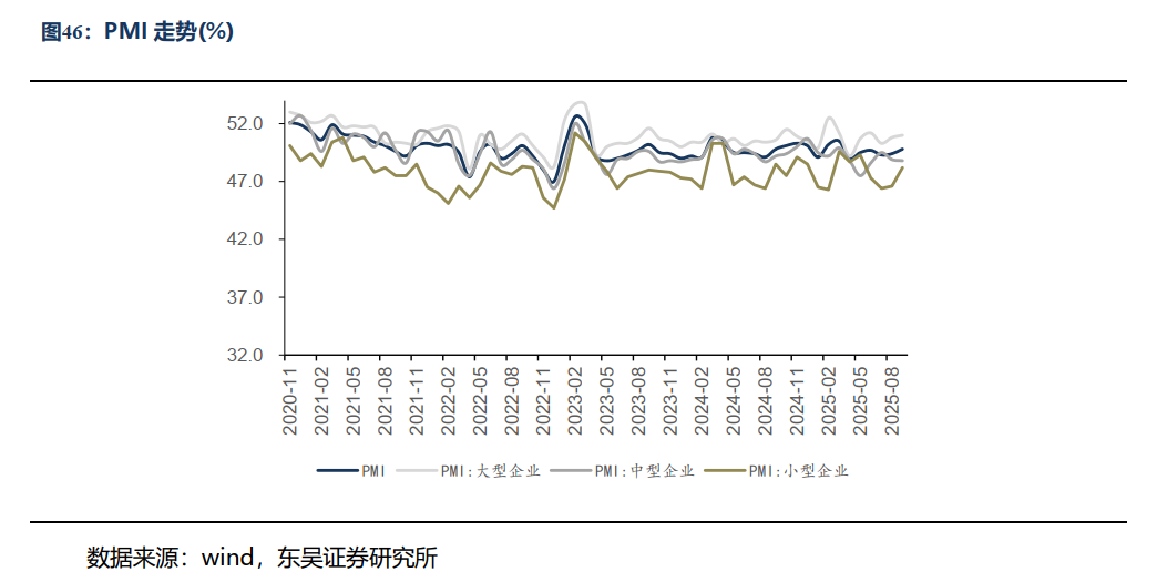 2025年9月制造业数据继续承压,9月制造业PMI 49.8%,前值49.4%,环比 0.4pct:其中大/中/小型企业PMI分别为51.0%/48.8%/48.2%,环比 0.2pct/-0.1pct/ 1.6pct;2025年8月工业增加值累计同比 6.2%;2025年8月制造业固定资产投资完成额累计同比 5.1%。2025年1-8月电网累计投资3796亿元,同比增长14.0%。