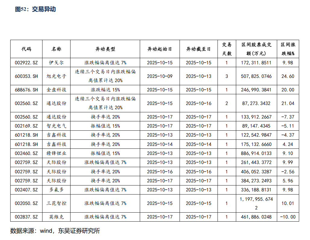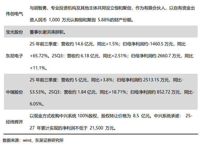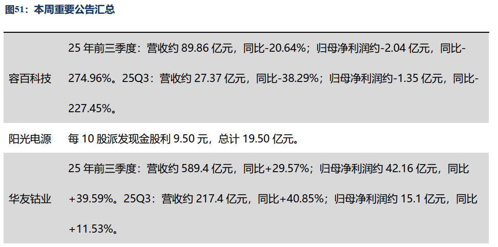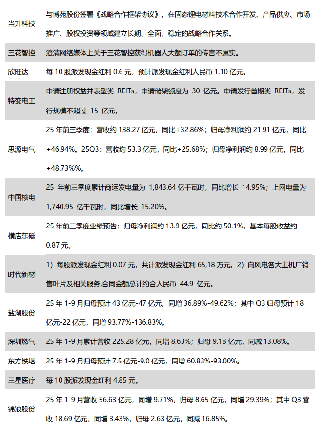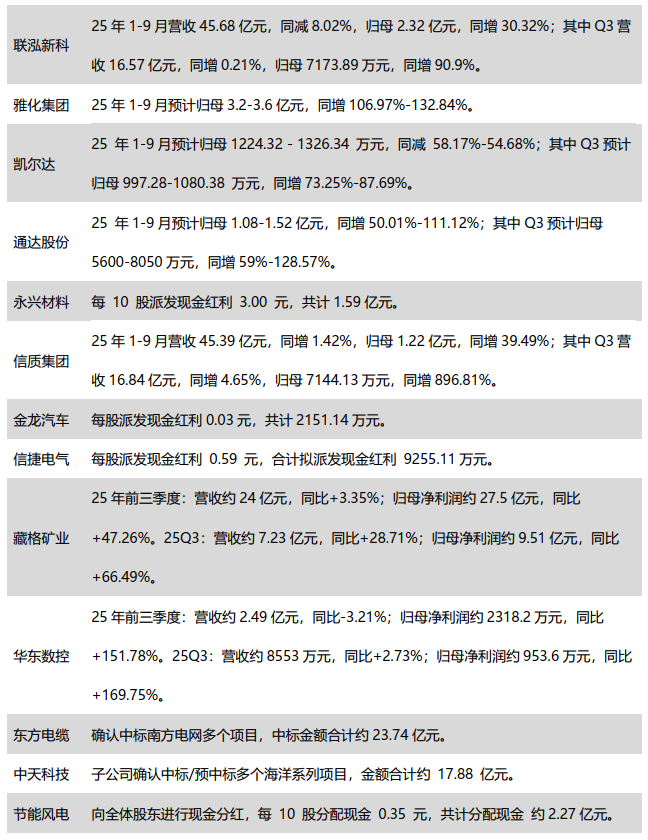 公司层面:思源电气:25年前三季度营收约138.27亿元,同比 32.86%;归母净利润21.91亿元,同比 46.94%;其中Q3营收约53.30亿元,同/环比 25.68%/ 1.13%;归母净利润约8.99亿元,同/环比 48.73%/ 6.20;容百科技:25年前三季度营收约89.86亿元,同比-20.64%;归母净利润约-2.04亿元,同比-274.96%;其中Q3营收约27.37亿元,同/环比-38.29%/-16.66%;归母净利润约-1.35亿元,同/环比-227.45%/-155.35%;阳光电源:每10股派发现金股利9.50元,总计19.50亿元;华友钴业:25年前三季度营收约589.4亿元,同比 29.57%;归母净利润约42.16亿元,同比 39.59%;其中Q3营收约217.4亿元,同/环比 40.85%/ 12.35;归母净利润约15.1亿元,同/环比 11.53%/ 3.18;当升科技:与博苑股份签署《战略合作框架协议》,在固态锂电材料技术合作开发、产品供应、市场推广、股权投资等领域建立长期、全面、稳定的战略合作关系。
