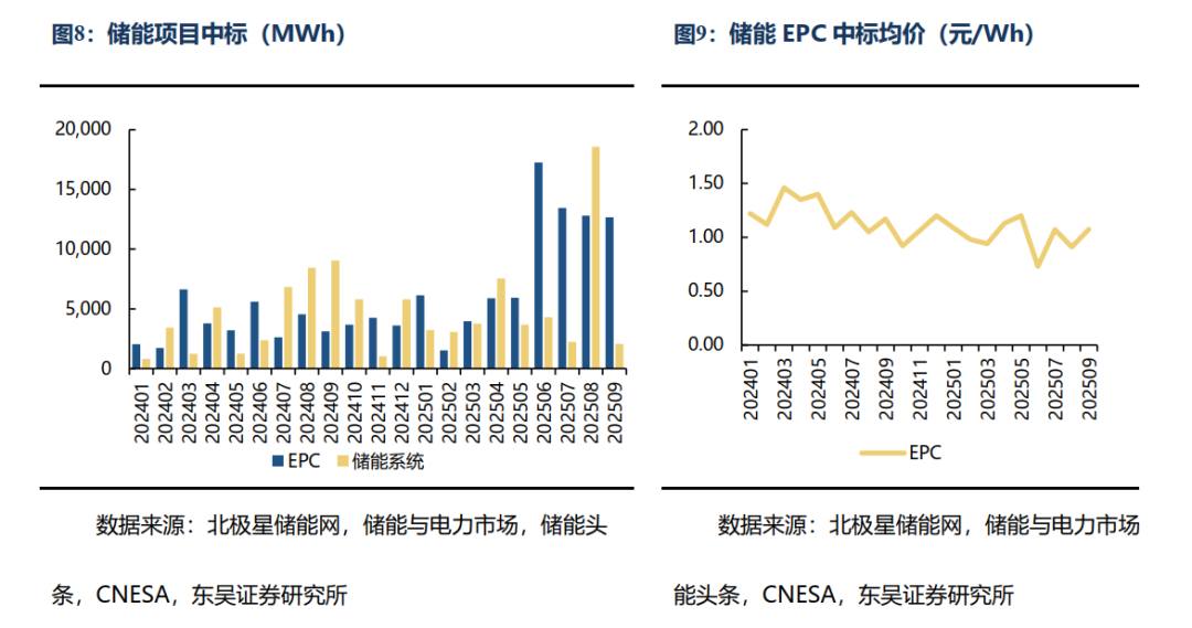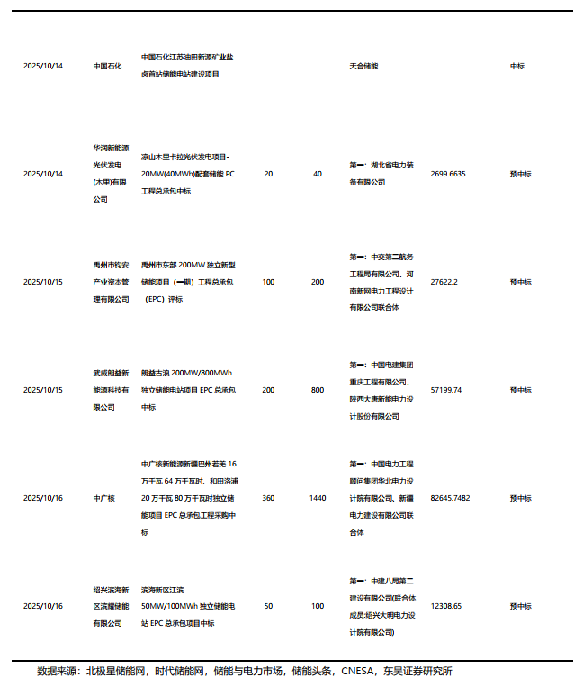 据我们不完全统计,2025年9月储能EPC中标规模为12.7GWh,环比下降1%,中标均价为1.07元/Wh,环比上升18%。截至2025年10月10日,2025年9月储能EPC中标规模为12.7GWh。