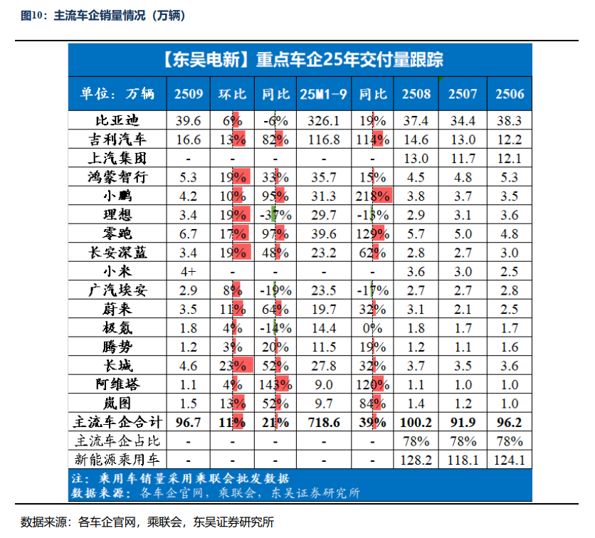 9月国内环比进一步向上,全年销量预计维持25-30%增长预期。9月国内主流电动车销量160.4万辆,同环比 25%/15%,累计同比增35%,全年预计增长30%,26年预计15% 增长。新势力中小鹏、零跑、小米、蔚来增长势头较强,传统车企中吉利维持高增。其中,比亚迪9月销量39.6万辆,同环比-6%/6%;吉利销16.6万辆,同环比 82%/ 13%;鸿蒙智行销5.3万辆,同环比 33%/ 19%;小鹏销4.2万辆,同环比 95%/ 10%;零跑销6.7万辆,同环比 97%/ 17%;蔚来销3.5万辆,同环比 64%/ 11%。