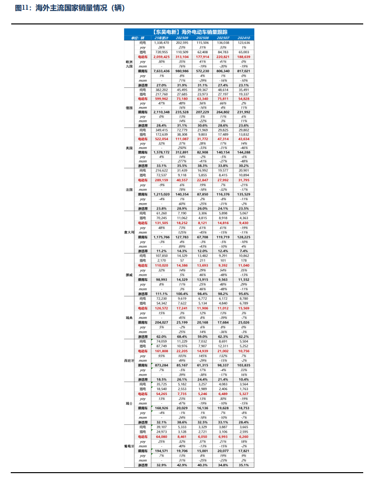 欧洲销量持续超预期,上修全年销量预期至30-37%增长,预计26年销量持续强劲。9 月欧洲 9 国合计电动车注册 31.3 万辆,同环比 35%/76%,电动车渗透率 31.9%,同环比 6.4/ 0.8pct;欧洲9国累计销量206万辆,同比 30%,上修欧洲全年销量至380-400万辆,同比增30-37%。同时Q4起欧洲新车型密集上市,预计26年将继续维持30% 增长。其中,9月德国电动车注册 7.3 万辆,同环 48%/ 16%,电动车渗透率 31.1%,同环比 7.4/ 0.5pct;英国电动车注册 11.1 万辆,同环比 37%/ 250%,电动车渗透率 35.5%,同环比 6.1/-2.8pct;法国电动车注册4.1万辆,同环比 6%/ 78%,电动车渗透率 28.9%,同环比 1.3/ 2.9pct;意大利电动车注册 1.8 万辆,同环 73%/125%,电动车渗透率 14.3%,同环比 5.7/ 2.3pct;挪威电动车注册 1.4 万辆,同环 14%/5%,电动车渗透率 100.4%,同环比 2.9/ 2pct;瑞典电动车注册 1.7 万辆,同环比 3%/45%,电动车渗透率 68.4%,同环比 3.4/ 7.4pct;西班牙电动车注册 2.2 万辆,同环比 103%/49%,电动车渗透率 26.1%,同环比 13.8/ 1.7pct;瑞士电动车注册 0.8 万辆,同环比 23%/47%,电动车渗透率 38.6%,同环比 7.5/ 6.1pct;葡萄牙电动车注册 0.8 万辆,同环比 32%/40%,电动车渗透率 42.9%,同环比 6.1/ 2.6pct。