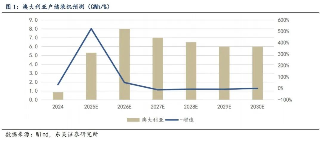 补贴驱动下户储需求爆发,26年户储有望继续高增。户储补贴政策激励下2025年澳洲户储装机达5GWh,我们认为新政策26年5月执行前,澳洲上半年会加码抢装大容量户储,装机容量或超过25年下半年;考虑新政对14kwh以内的装机容量更友好,我们认为26年下半年起装机户数将继续增加,但每户装机容量或有所下降。全年我们预计装机或有望翻倍增长至8gwh左右,预计27-30年依旧维持高装机水平。