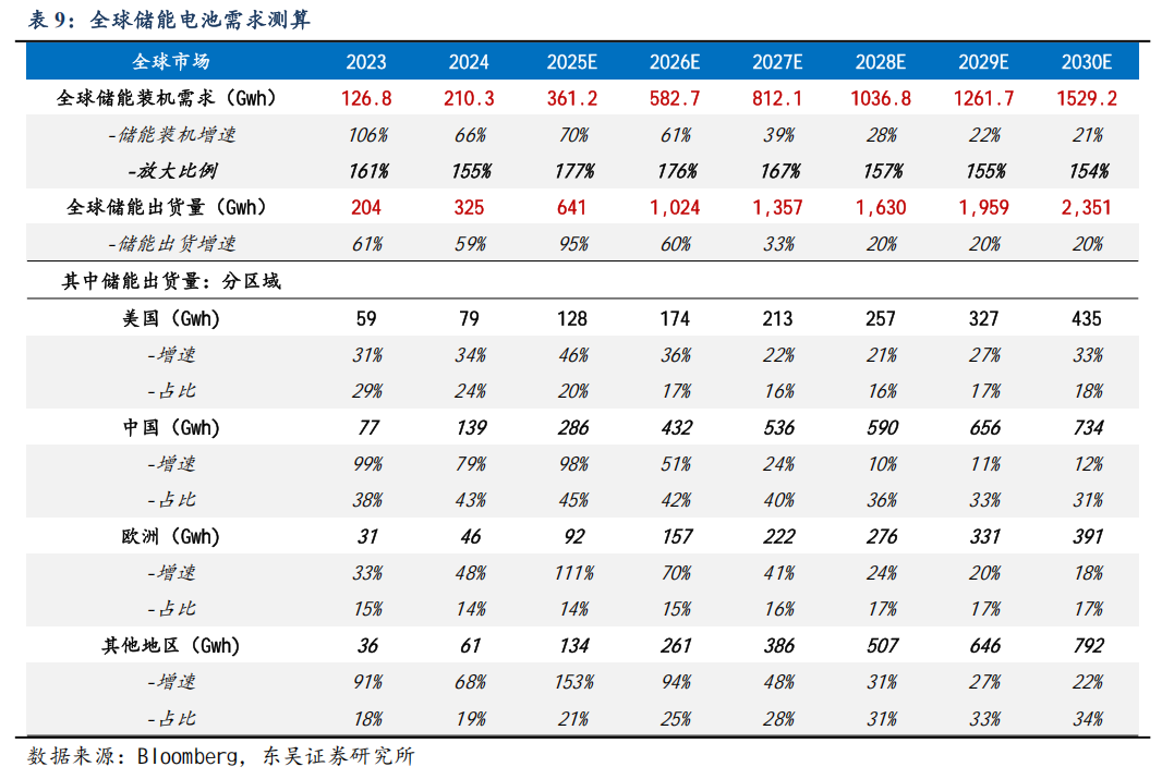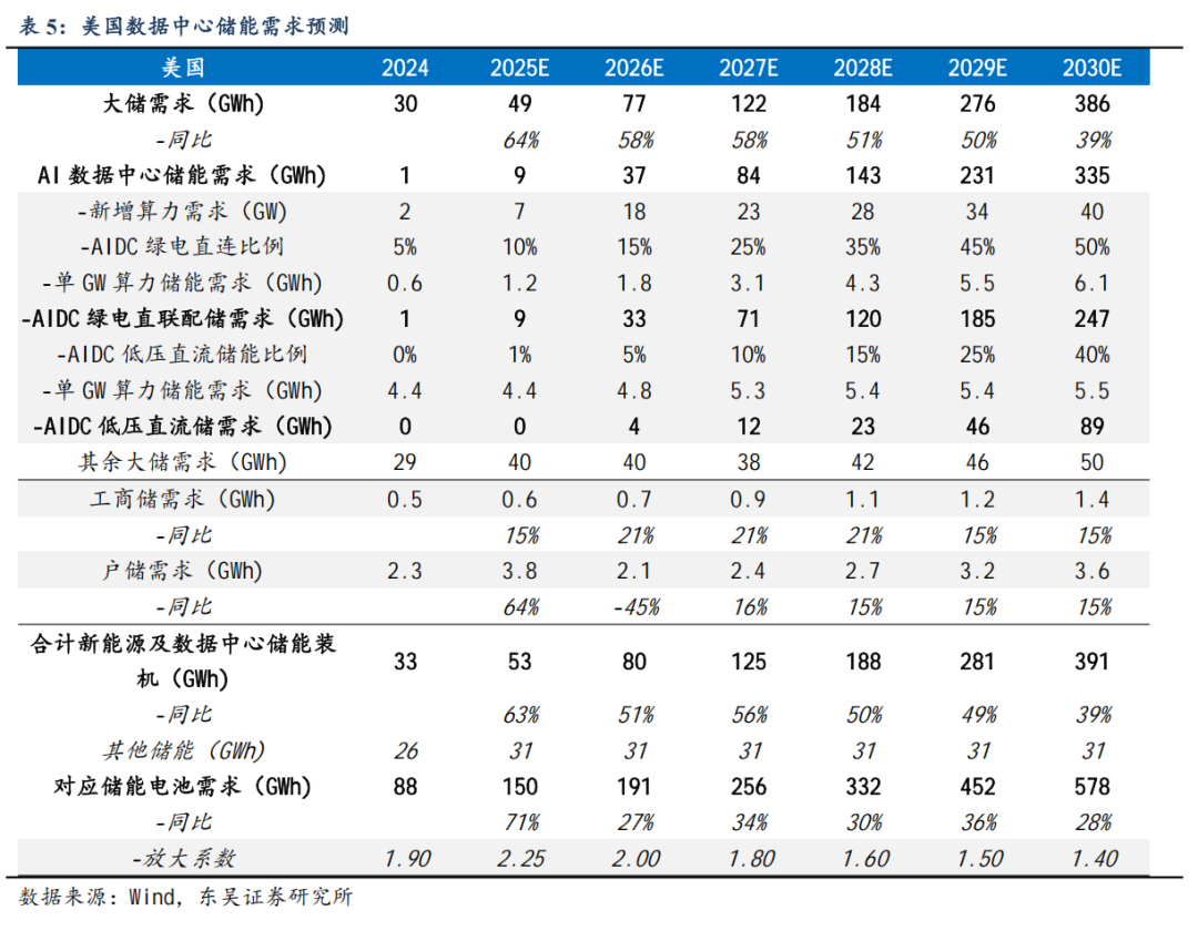 AI储能加持,美国储能预计可持续高增。按照2030年美国累计AI算力153GW,当年新增40GW测算,未来5年美国电力需求年复合增长4-5%。其中AI算力2030年需用电1269TWh,占总体用电量22%。发电新增装置看,假设50-65%新增装置位光伏,则26年新增发电装置需35GW 、2030年为215GW,远高于目前美国备案量(30-40GW)。我们预计2026年美国储能装机需求80GWh,同比增近51%,其中数据中心相关(绿电直联配储 电能管理)合计37GWh。电池需求端,考虑抢装,我们预计2025电池需求150GWh,同比增71%,预计2026年191GWh,增长27%,此后,受益于AI数据中心拉动,美国储能维持可30-50%增长。若后续绿电比例提升,需求将进一步超我们预期。