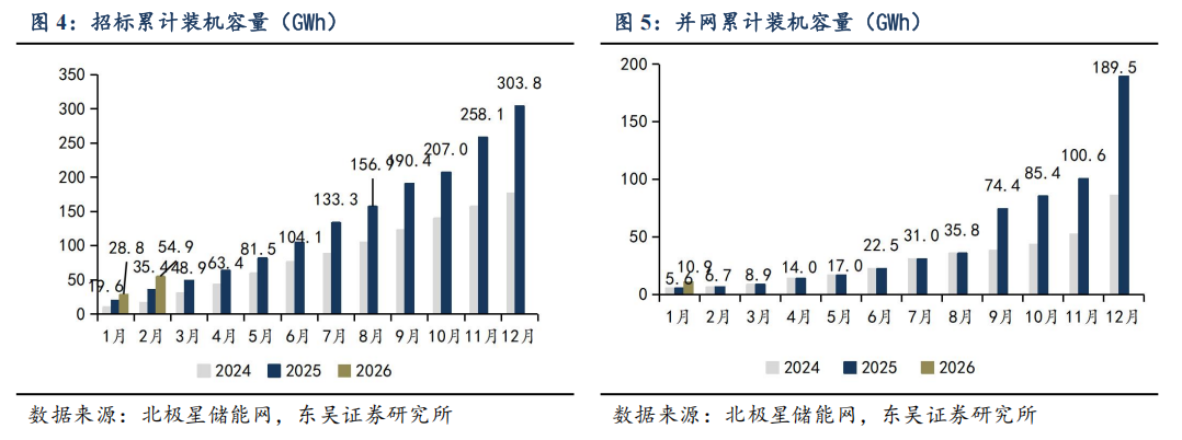 实际落地层面,国内储能招标与并网节奏明显加快:25年累计并网容量189.5GWh,同比 120%,26年1月并网容量10.9GWh,同比 95%。政策驱动叠加项目收益率改善,推动国内储能装机需求加速释放,行业需求有望超此前预期。
