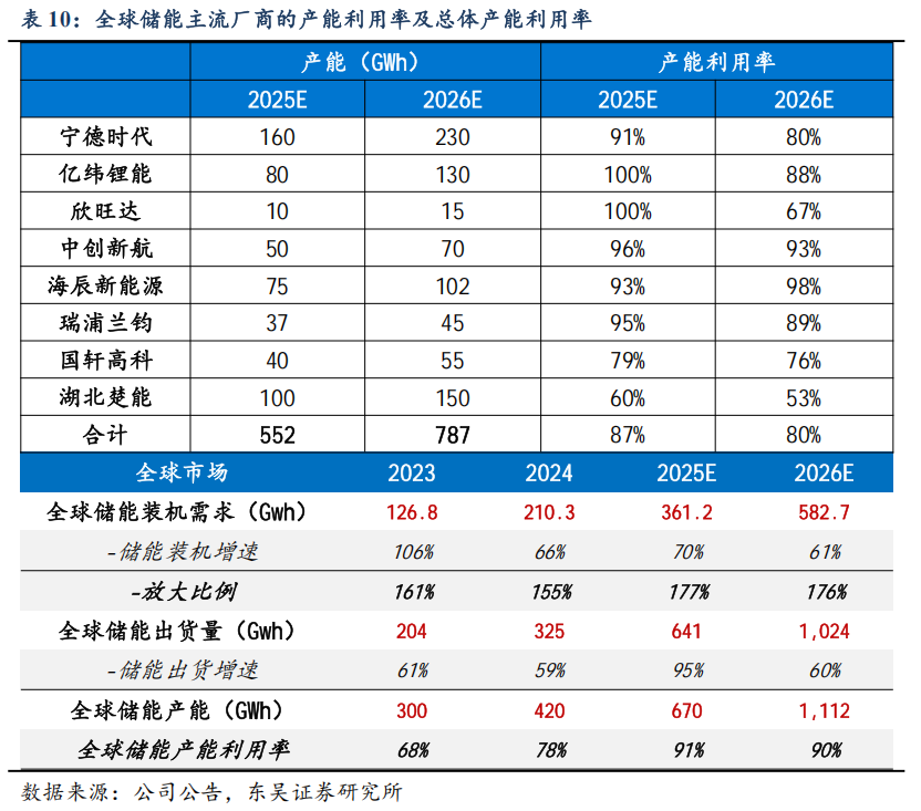 全球储能供需格局看,需求端保持高增速,供给端产能虽快速扩张,但利用率维持高位,整体供给相对紧缺。我们预计26年全球储能装机需求583GWh,同比增长61%;对应出货量约1024GWh,同比增长60%。26年新增产能释放,26年全球储能产能约1112GWh,产能利用率高达90%,头部公司我们预计可达90% 。
