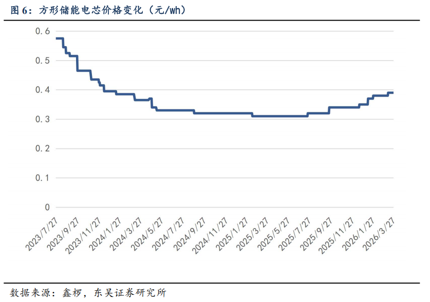 储能电池具备价格弹性,部分型号电芯已上涨。国内储能商业模式改变,对电池性能要求提升,280电芯大规模应用,供给紧缺,随着碳酸锂价格上涨,26年1-2月起储能电芯价格陆续由0.35元/Wh 上涨至0.39元/Wh ,其中碳酸锂涨价2万影响1分/wh左右,电池价格超涨1-2分。