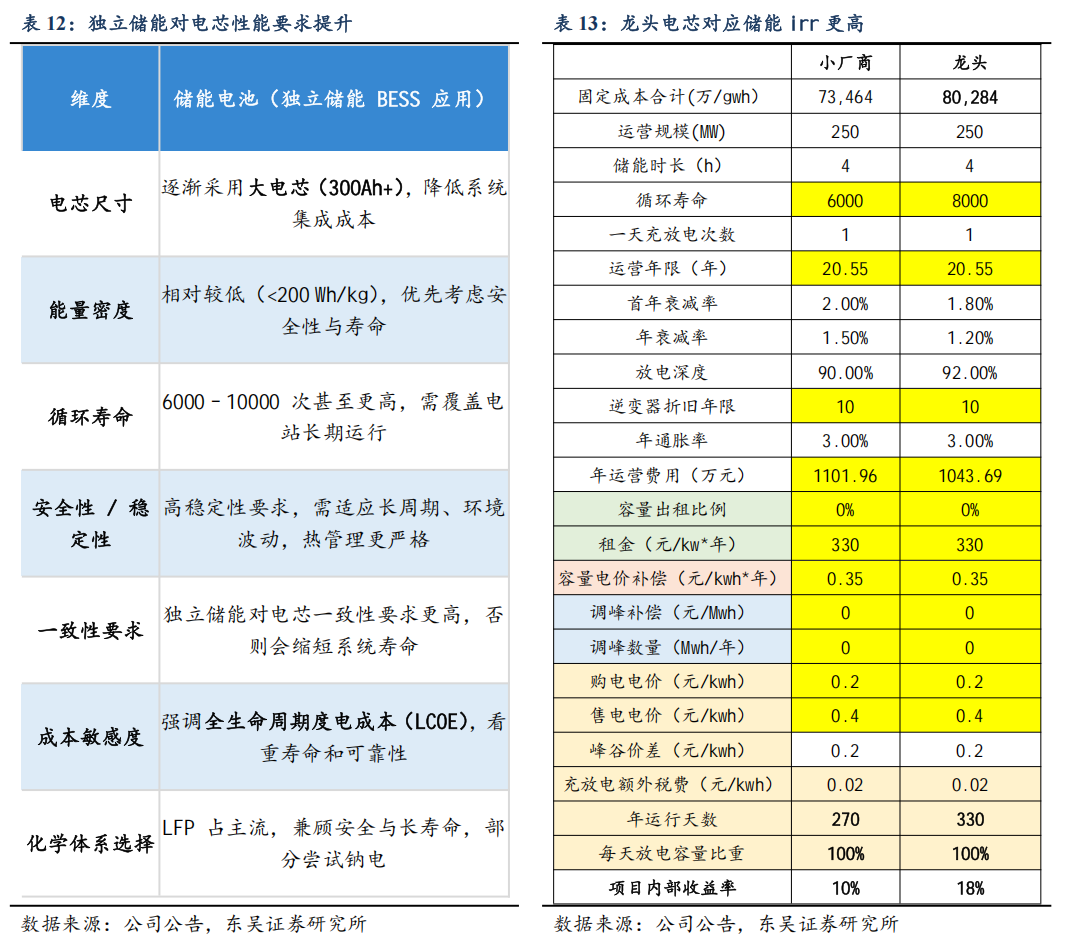 龙头储能大电芯稳定性、循环性更优,考虑电芯售价高于同行15-20%情况下,由于一年利用天数可高达330天以上、首效高、衰减低,irr高于小厂商电芯8-10pct,我们预计份额将进步提升。