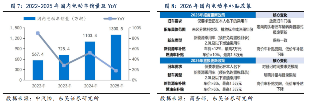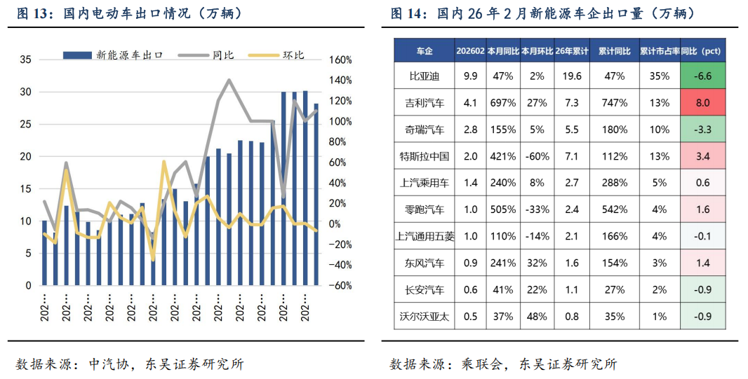 26年国内电动车补贴延续,我们预计本土新能源车销量1428万辆,同比 2.9%。26年电动车补贴延续,补贴标准与车价挂钩、向中高端车型倾斜,报废更新环节新能源车补贴为车价的12%(上限2万元)、燃油车为10%(上限1.5万元),置换更新环节新能源车补贴为车价的8%(上限1.5万元)、燃油车为6%(上限1.3万元)。政策补贴下,我们预计26年国内新能源车销量为1428万辆,同比 2.9%。26年1-2月,国内新能源车销量约为158.7万辆,同比-7.2%。随着4月新车密集上市,预计销量增速有望转正。