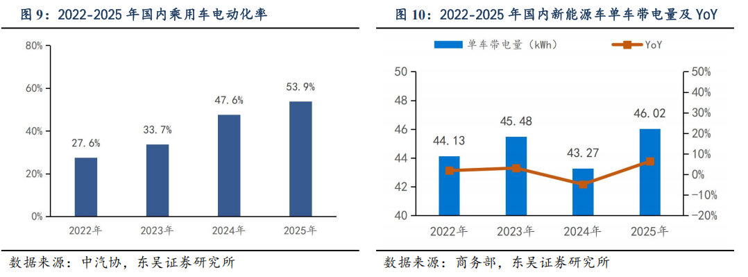 我们预计26年国内新能源车电动化率55%,同比 1pct,单车带电量为52KWh,同比 14%,插电车型单车带电量增速高于纯电车型。2022-2025年国内新能源车电动化率逐年稳步提升,25年本土电动化率达53.9%,单车带电量46 KWh。我们预计2026年电动化率55%,同比 1pct,单车带电量52.2 KWh,同比 14%。其中纯电车型单车带电量为63.2KWh,同比 12%,插电车型单车带电量33.9KWh,同比 20%。