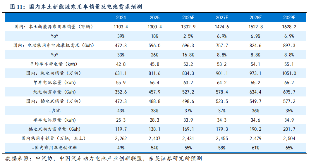 国内方面,补贴政策延续、单车带电量提升及重卡电动化有望超预期等因素推动下,我们预计26年国内电动车销量可达1428万辆,同比 2.9%,动力电池实际需求896GWh,同比 22%。