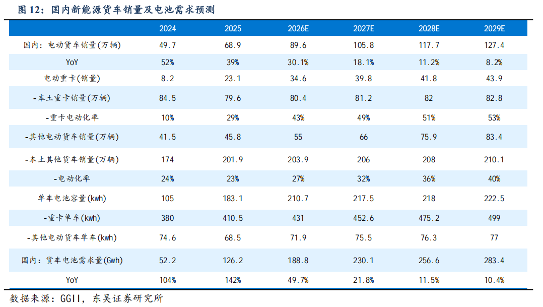 国内商用车销量方面,我们预计26年电动货车销量为89.6万辆,同比 30.1%,电动重卡销量为34.6万辆,同比 50%。在购置税减半和以旧换新政策驱动下,25年电动重卡增长迅速,销量为23.1万辆,同比 181%,我们预计26年电动重卡销量有望维持高增,达34.6万辆,同比 50%。电动化率方面,25年国内重卡电动化率为29%,同比 19pct,单车带电量410.5KWh,同比 8%,我们预计26年重卡电动化趋势持续推进,电动化率预计达43%,同比 14pct,单车带电量为431KWh,同比 5%。