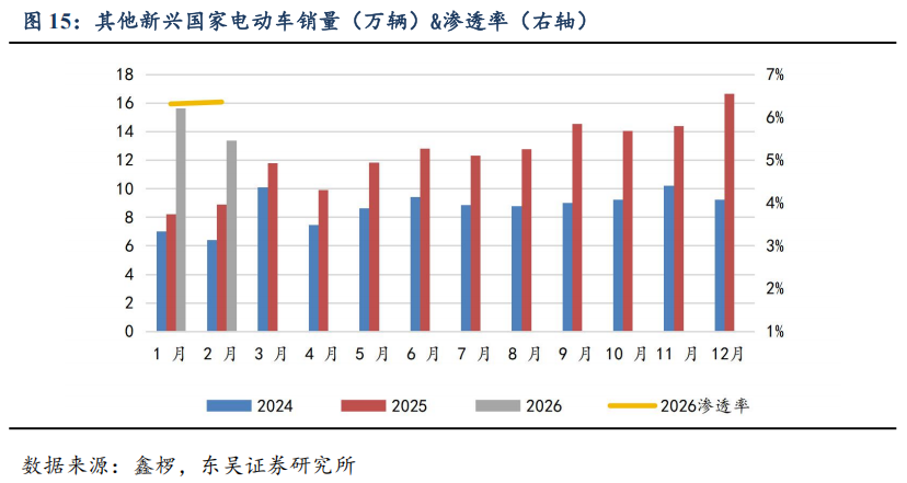 新兴国家26年2月销量同增50%,1-2月累计销售29万辆,同增69%。新兴国家(东南亚、拉美、中东等)新能源汽车2月销13.4万辆,同环比 50%/ 91%,渗透率6%。1-2月新兴国家销量累计29万辆,同比增69%,渗透率6%。