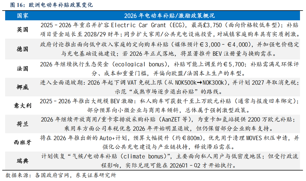 欧洲各国出台政策有望推进电动车销量持续增长。英国重启并扩容Electric Car Grant(ECG),最高补贴约£3,750,并将资金延续至28/29财年;德国政府正讨论推出面向低中收入家庭的定向补贴(约€3k–€4k),若26年落地,有望提升BEV换购与注册量;法国确认26年继续执行生态奖金,并有调升空间(预计约€5,700);意大利进一步强化强刺激政策,私人购车补贴普遍落在数千至一万欧元级,并与报废旧车挂钩;西班牙计划推出Auto 新计划并大幅扩充预算(约€8亿级)。