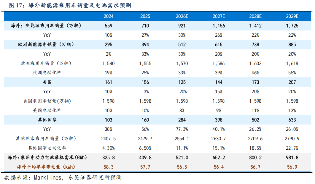 海外方面,国内出口高增、欧洲政策加码及新兴市场电动化率广阔,我们预计2026年海外电动车销量921万辆,同比 30%,动力电池实际需求521 GWh,同比增长27%。