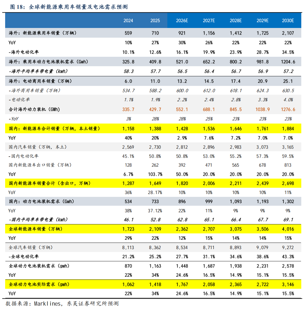 我们预计2026全球电动车销量2362万辆,同比 12%,全球动力电池实际需求1767GWh,同比 24.6%。
