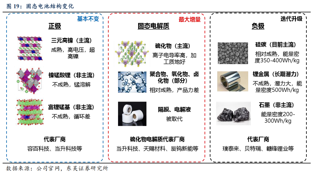 电池材料体系已基本定型,硫化物全固态为量产趋势,负极短中期选用硅碳路线,长期向锂金属迭代。目前来看,国内宁德时代、比亚迪、华为,日本的丰田、松下,韩国的三星SDI、LG新能源、SK on,美国的Solid Power等均重点布局硫化物体系。负极方面,技术能力强的电池厂突破锂金属/无负极路线,二线厂商布局硅碳负极路线,后者为短中期量产主流路线,而前者具备更强的商业化意义。