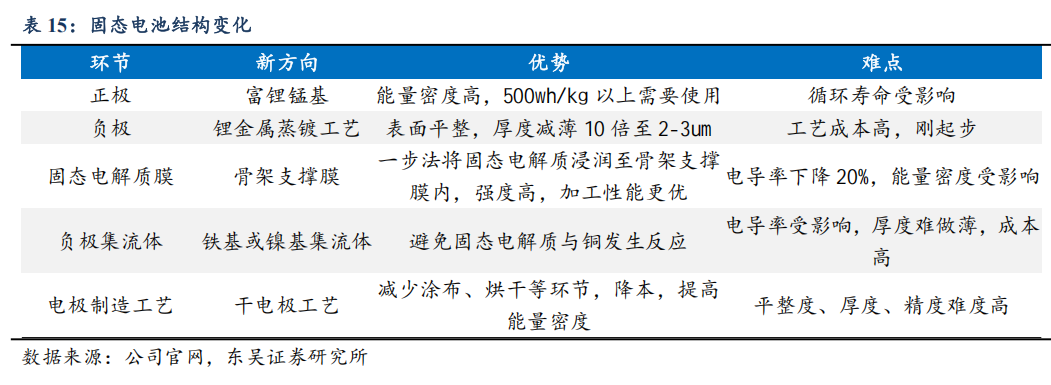 固态电池新材料和新技术加速开发。1)正极:短期沿用高镍体系,长期向富锂锰基迭代。富锂锰基能量密度最高,但存在循环寿命等一系列短板,且电压为4.8v,与硫化物4.3电压不匹配,27-28年有望迎来机会。2)负极:蒸镀金属锂。传统锂金属负极采用轧制工艺,无法解决减薄和平整问题,蒸镀锂金属工艺具备厚度减薄至2-3μm(传统轧制15-20μm)的优势,同时表面形貌可制造极其均匀。3)固态电解质膜:使用骨架支撑膜。该技术为过渡性技术,将固态电解质浸润至骨架支撑膜内,强度高,加工性能更优,但电导率和能量密度受影响。4)集流体:铁基或镍基集流体。避免固态电解质与铜发生反应,但电导率受影响。5)干电极工艺:减少涂布、烘干等环节,降本,提高能量密度。率先在正极端使用,后续逐步突破负极和固态电解质膜。