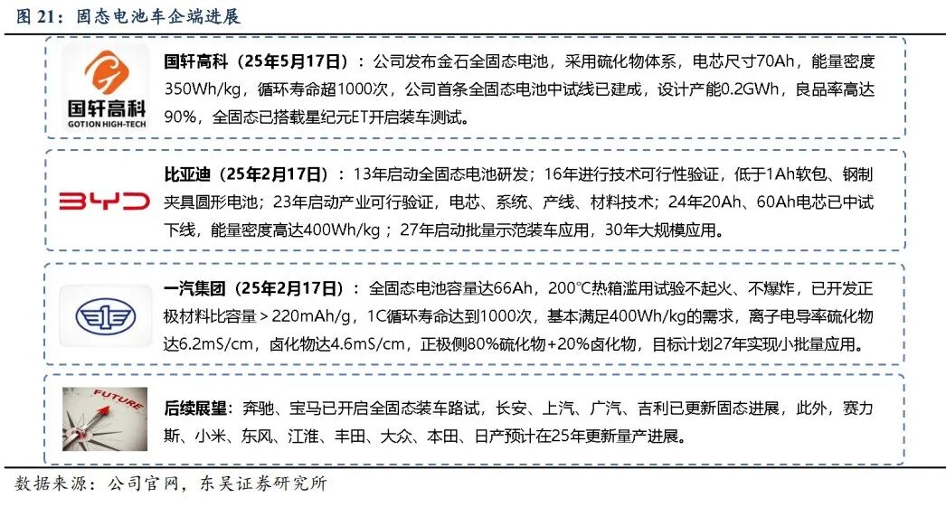车企持续更新进展,量产节奏快于此前预期。中国电动汽车百人会相关负责人表示,全固态电池预计27年开始装车,30年是完全可以实现量产的,国内主要汽车电池企业聚焦硫化物全固态,目标实现动力电池能量密度400wh/kg 。从企业端看,比亚迪、国轩高科、一汽集团60Ah车规级电芯已下线,能量密度可达350-400Wh/kg,充电倍率1C,循环寿命1000次,节奏时间早于预期半年左右(此前预期25年年底),我们预计26年进入车企全固态路试的密集期,核心催化点在于GWh级量产线的招标 固态相关车型的路试。