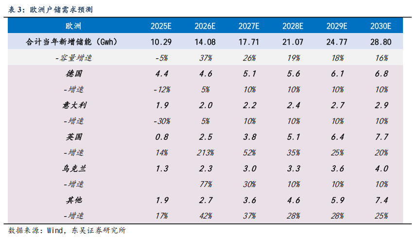 欧洲:乌/英/荷为重要增量市场,德国需求有望复苏。德国是传统高户储装机国,多政策推动户储通过VPP参与辅助服务,需求有望复苏。英国26年起强制新建建筑配置光伏,同时推出“温暖家园计划”给予150亿英镑推动光储热泵发展,有望带动300万户家庭新增光伏,我们预计可带来24gwh户储增量空间。乌克兰发电设施毁损严重,全国停电严重,政策补贴 灾后生存刚需推动下户储高增,26年我们预计装机超2gwh,若后续进入灾后重建,预计增量空间达34gwh。荷兰高户光渗透率下,存量配储率不足10%,取消净计量政策倒逼存量用户增配储能,我们预计将带来20gwh 增量空间。波兰、匈牙利及东欧等多国纷纷出台政策支持户储发展,2026年我们预计欧洲户储装机可达14gwh,同增37%,27-30年维持10-20%复合增速。