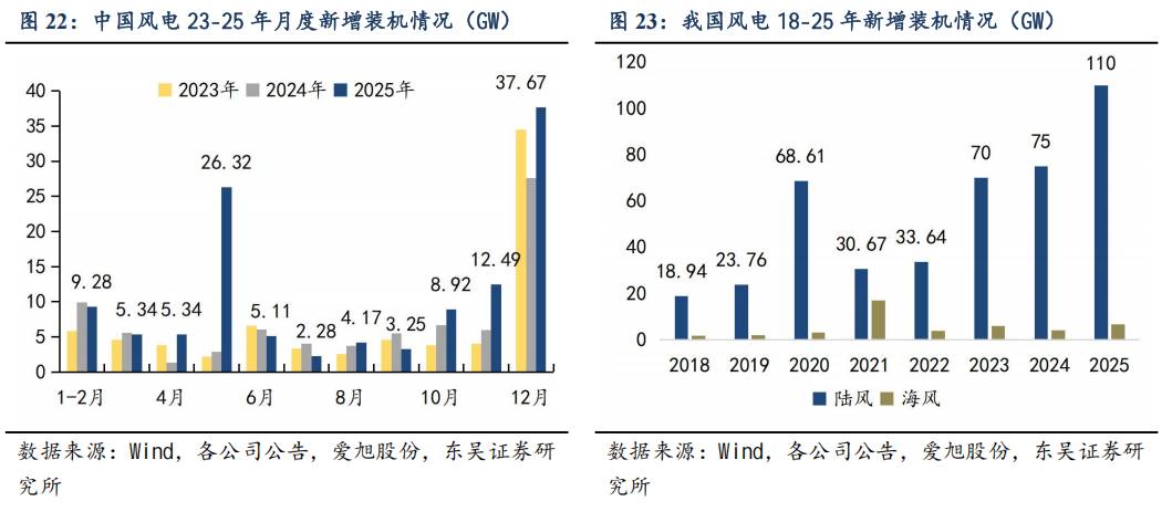 2025年国内风电装机维持高增长。据国家能源局数据,2025年全年风电新增并网装机1.2亿千瓦(同比约 51%),其中陆风新增1.1亿千瓦、海风新增659万千瓦,表明在电源结构持续调整背景下,风电仍是新增装机的核心方向之一。