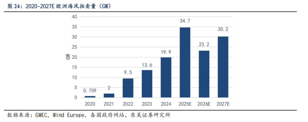 拍卖/FID持续高景气。1)拍卖:24年欧洲海风拍卖20GW(同增46%),Wind Europe预计25-27年分别为34.7/23.2/30.2GW;2)FID:23-24年分别达356/79亿欧元,18-24年FID总量约31GW,剩余19GW将于25年起确定性装机并网。Wind Europe预测26-30年欧洲海风年均装机6-7GW(英国占比近50%),25-30年年均复合增速21%。