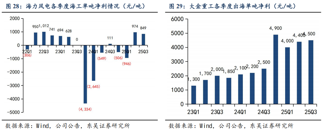 国内方面,盈利拐点已至。25Q2起江苏海风项目开工带动管桩企业盈利回升,海力风电25H1海工毛利率16.3%(同比 2.6pct),25Q2海工单吨净利恢复至974元/吨。我们认为,深远海化带动导管架渗透率提升,有望通过产品结构升级打开单吨净利上限,使得盈利改善具备更强持续性。