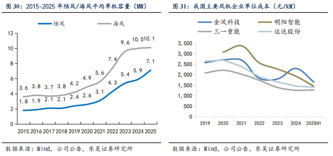 风机价格企稳反弹,累计涨幅超5%。24Q3末陆风风机中标价底部反弹3-5%,25Q2又小幅反弹,25年陆风机组(含塔筒)均价2050元/kW,风机(不含塔筒)1574元/kW。多家主机厂反内卷,报价策略趋保守。
