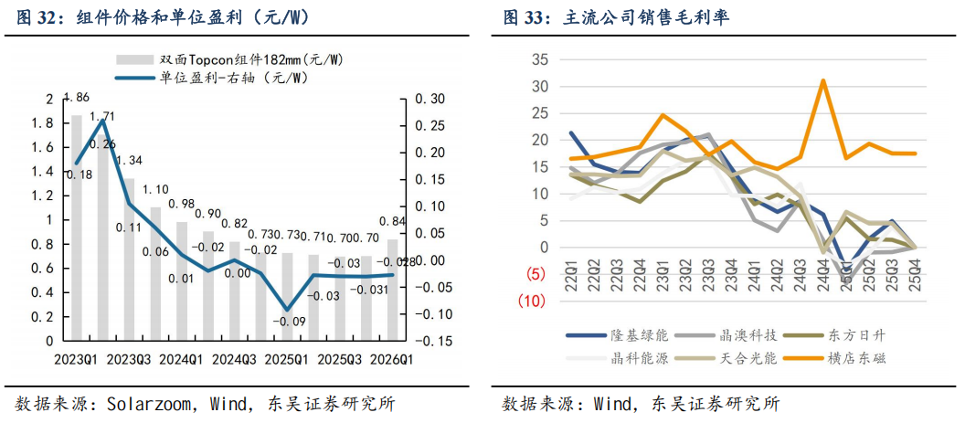 产业链盈利承压触底,26年组件价格已现反弹。组件价格累计跌幅超六成,25Q1触底后已出现反弹。组件价格从2023Q1的1.86元/W一路降至2025Q3的0.69元/W,单位盈利在25Q1触底-0.09元/W后逐步修复。进入2026年Q1,晶科、隆基、天合、晶澳等头部厂商接连上调报价,主流组件价格较前期低点涨幅普遍达15%-20%,晶科650W以上产品平均涨幅约30%-40%,部分高功率产品涨幅最高达50%,TOPCon组件Q1主流成交价已升至约0.84元/W,印证价格底部已过。