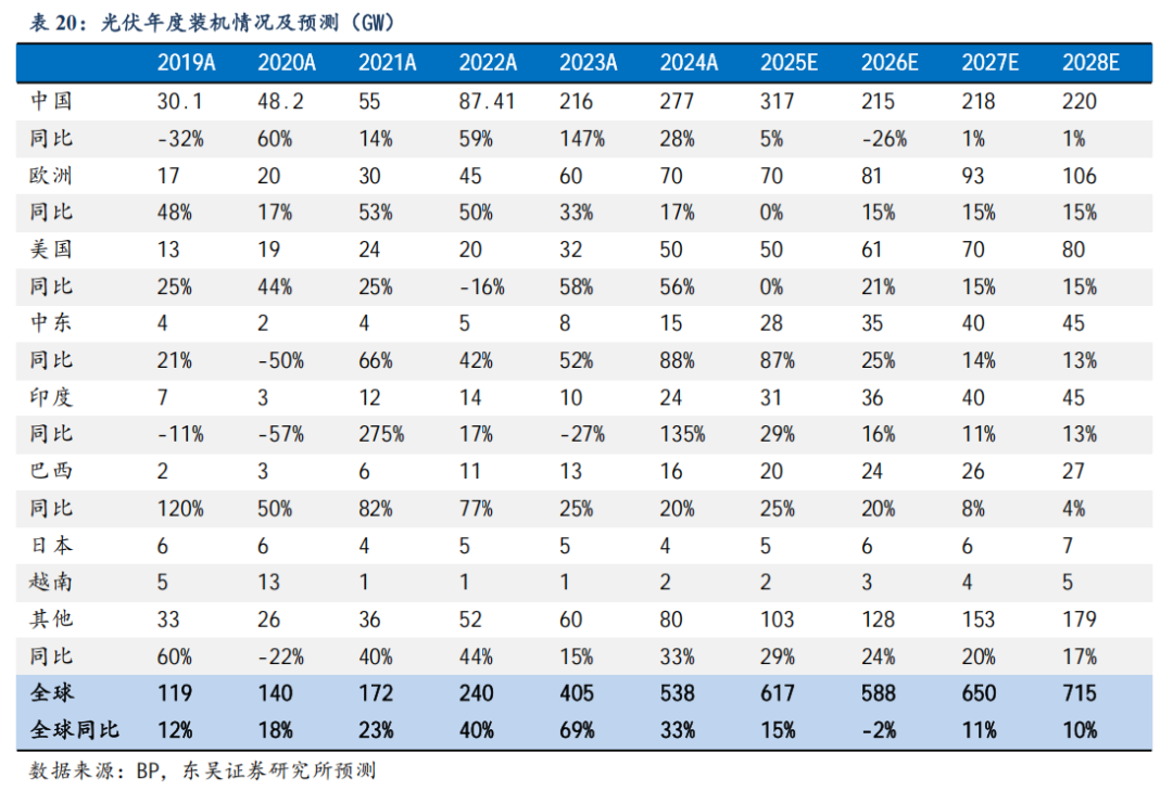 2025年全球装机增长稳健,中国占比近半,新兴市场贡献显著增量。我们预计2025年全球新增光伏装机617GW,同增15%,其中中国/美国/欧洲分别新增装机317/43/70GW,同比14%/0%/-14%,预计2026年全球新增装机约588GW,同比小幅回落。