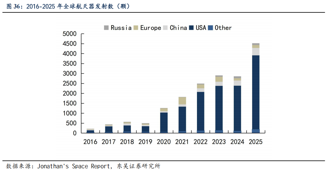 太空已成大国战略博弈新战场,航天发射进入"指数级"增长周期。低轨频段与轨道位置具有"不可再生"属性,在ITU"先登先占"规则驱动下,各国加速抢占。近10年全球航天器发射数自2016年237颗增长至2025年超4300颗,CAGR达34%,25年同增超50%。可回收火箭技术成熟推动发射成本断崖式下跌:SpaceX约1400-1800美元/kg,中国约6000-10000美元/kg。
