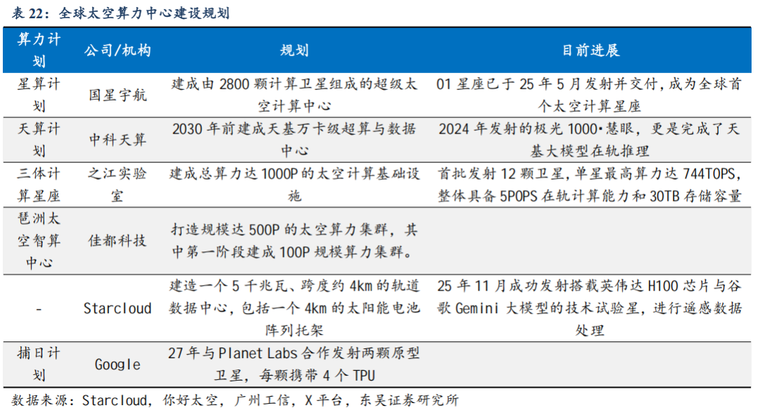 太空算力是AI算力体系从地面向轨道延伸的全新范式。太空可利用近乎无限的太阳能实现高效供电,借助深空超低温环境自然冷却降低能耗。Musk规划太空和地面各建设GW级能源基础设施——"星舰将实现在轨吉瓦级基础设施"。全球多个太空算力中心项目已启动。之江实验室"三体计算星座"(首批12颗卫星,5POPS算力)、国星宇航"星算计划"已率先完成首批算力卫星发射;海外Starcloud规划建造5GW轨道数据中心。若后续构建10GW太空算力系统,太阳翼市场规模或达约3万亿元。远期50GW场景下市场空间超7万亿元。