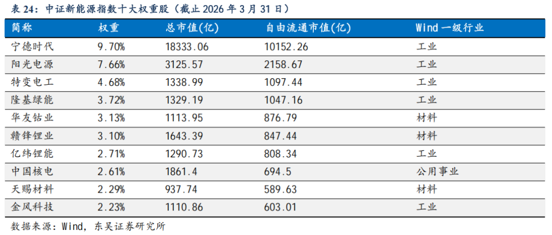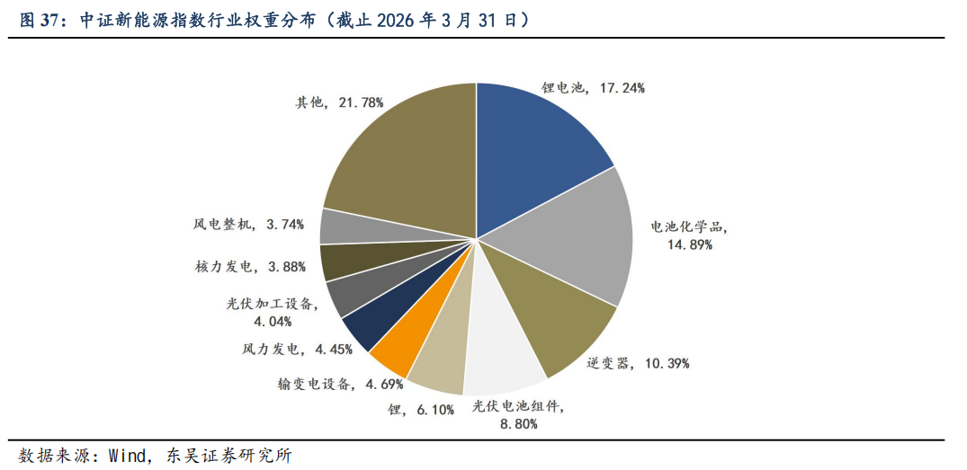 行业分布广泛,全景覆盖新能源产业链核心环节。中证新能源指数(399808.SZ)在行业分布上呈现出对新能源产业链细分领域的全面且深度的覆盖。根据截至2026年3月31日的成分数据,指数精准涵盖了储能与动力电池、光伏、风电、核电及上游核心材料等高景气赛道。具体来看,锂电池及电池化学品相关细分板块合计权重超32%(其中锂电池17.24%、电池化学品14.89%),彰显对储能与动力电池核心环节的强力聚焦。光伏产业链(涵盖逆变器、光伏电池组件、光伏加工设备等)占比同样突出,其中逆变器权重达10.39%,光伏电池组件达8.80%。此外,风力发电及风电整机板块合计占比达8.19%,输变电设备与核力发电等电力基础设施板块亦有充分代表。这种多维度、高细分颗粒度的权重分布,深刻反映了指数“全景式”布局新能源全产业链的特色,有效分散了单一细分赛道的非系统性风险,是捕捉新质生产力中绿色低碳与先进制造红利的优质β工具。