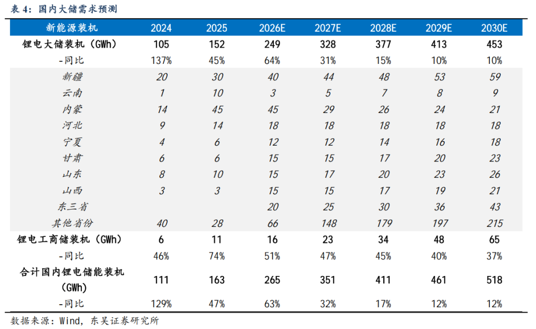 大储装机需求将继续向“资源富集 现货价差 容量补偿”省份集中,需求持续增加。25年装机约150gwh,26年约250gwh,同增60% 。中国2025-2027年大储装机需求明确且强劲,增长由清晰的省级目标、跑通的经济模型和多元的应用需求共同驱动。新疆、内蒙古是近25-26年的增长核心,我们预计贡献40-50%装机。同时,其它已出容量电价补充或具备政策与电网侧场景支撑的省份预计需求将进一步增加。我们预计25年储能装机163GWh ,同比 47%;预计26年装机265GWh ,同比增长60% 。