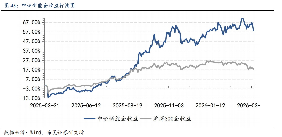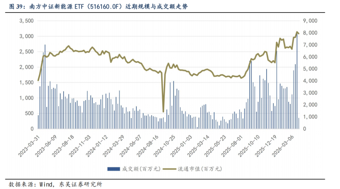 南方中证新能源ETF(516160)跟踪中证新能源指数,提供一键覆盖新能源全产业链的指数化工具。储能方面,户储、大储、工商储全面增长,全球多点开花,我们预计全球储能装机26年60%以上增长,27-29年复合30-50%增长。锂电方面,需求强劲且盈利持续改善,全球能源危机下优势凸显。国内动力需求初步恢复,叠加单车带电量提升与油价上行,出口持续超预期,预计26年全球动力需求增速20% ;伴随各地容量电价出台带动储能需求提速,预计26年锂电整体增长30% ,27年维持20% 增速。排产端3月创新高,4月环比进一步提升0-5%,随着Q2旺季开启新一轮涨价,电池及各材料环节(碳酸锂、隔膜、铜箔、六氟等)顺利顺价落地,需求与业绩持续兑现。风电方面,欧洲能源安全下海风景气加速,26年国内海风有望重拾高增长,进入新的景气周期,26年陆风保持平稳,我们预计110GW ,风机毛利率逐步修复。光伏方面,政策引导“反内卷”,行业秩序正在修复,“十五五”期间装机目标明确,分布式光伏、光伏 (农业、建筑一体化等)等场景不断拓展,太空光伏带来大增量空间可能。