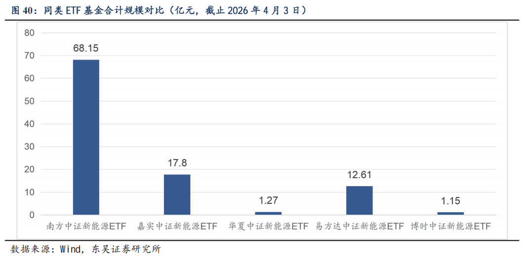 规模优势明显,资金体量居同类前列。截止2026年4月3日,南方中证新能源ETF的合计规模达68.15亿元,在全市场同类标的中规模领先。较大的底仓规模及相对较低的费率(管理费0.15% 托管费0.05%),使其在应对申赎时具备较好的缓冲能力。
