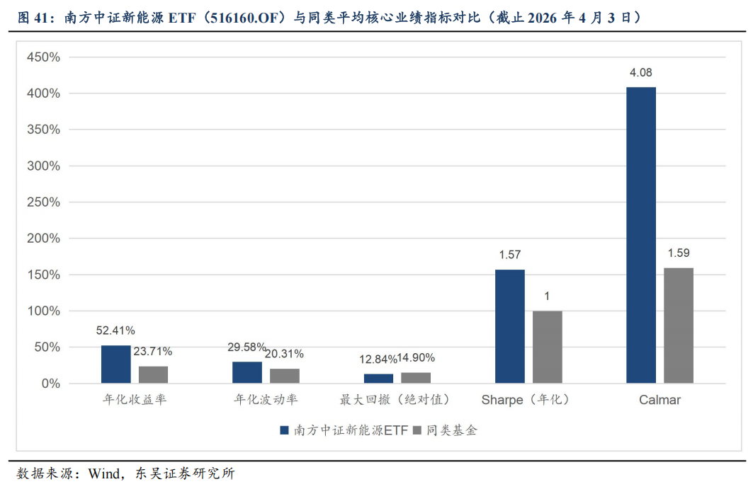 综合业绩及风控指标在同类中具备竞争力。从近一年(截至2026年4月3日)业绩表现来看,南方中证新能源ETF实现了52.41%的绝对回报,Alpha为22.22,信息比率达到1.57,年化夏普比率为1.57,展现出较好的收益转化能力。风险控制层面,该基金近五年的长期维度上实现了1.41%的年化回报与8.81的年化Alpha,近一年索丁诺比率达到3.47,下行风险为16.77,区间最大回撤为-12.84%(同类被动指数型基金平均-14.90%),衡量收益回撤比的Calmar比率达到4.08(同类均值1.59),体现出较为扎实的抗跌属性与整体配置性价比。