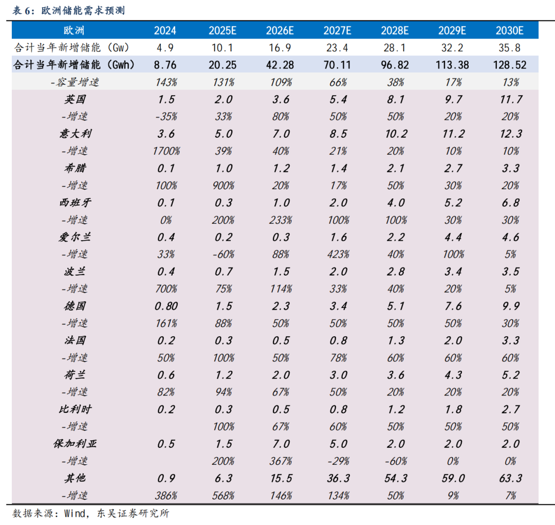 欧洲市场多点开花,容量电价政策支持力度大,且电力交易价差大,南欧和东欧等近2年增量明显,我们测算25年意大利、英国、德国、荷兰新增装机5/2/1.5/1.2GWh,同比 39%/33%/88%/94%。希腊、西班牙24年基数较低,25年新增装机同增900%/200%。预计26年欧洲新增储能装机42.28GWh,同比 109%,到30年欧洲新增装机有望达128 GWh。我们预计26年大储装机42GWh,同增109%。