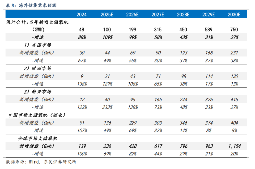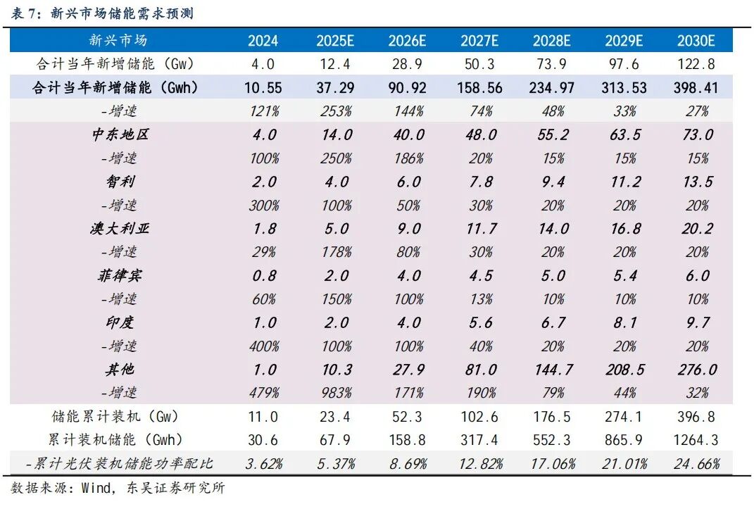 新兴市场方面,储能需求主要来自中东、澳大利亚、东南亚、南美,我们测算25年新兴市场大储装机37.29GWh,同比增253% ,26年预计装机90.92gwh,同比增约144%,其中,中东预计增长至40gwh,智利增长至6gwh,澳大利亚9gwh,菲律宾、印度各贡献4gwh。
