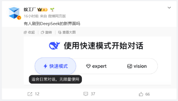 而这些观点主要依据近期各种动态的交叉印证。比如DeepSeek官网、APP频繁出现服务中断,就被外界解读为新模型上线前的服务器压力测试。另外有科技博主@蚁工厂 发现了新界面,其中除了快速、专家模式外,还有一个“Vision”视觉模式。