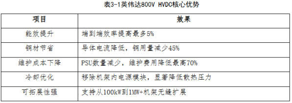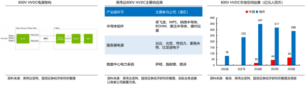 单柜功率迈向MW级,给传统电源系统带来局限。在AI行业大发展的背景下,推动GPU的算力能力持续迭代增长,对应的功率也在不断被推高。同时,服务器机架的设计也在向高密度方向发展。综合来看,AI服务器机架单柜功率正在从千瓦级迈向兆瓦级。传统的电源系统在此背景下,效率、空间以及铜排用量等局限性开始凸显:空间限制:机架电源在兆瓦级Kyper机架上需要占用64U空间,将压缩计算空间;效率:电力传输过程中反复交、直流转换,在功率提升背景下,效率损失带来的耗电量显著提升。HVDC具有优势,开始成为共识。高压直流路线,交、直流端转换更少,端到端效率能够提高显著;配套专用的电力机架计算机架,也可以释放空间容纳更多计算资源,在铜排用量、散热、可拓展性等方面优势也比较明显。其中, /-400V方案,能够沿用电动车行业成熟的供应链系统,可能成为未来发展的主流。过去主要CSP厂商对于HVDC方案,已有较多讨论。GTC2025期间,英伟达发布800V高压直流Kyber Side Car,推动数据中心电力基础设施的迭代。维谛、台达、麦格米特等上游供应商也先后发布相关解决方案,HVDC开始逐渐成为共识。HVDC技术因其高效、可靠、节能的特性,逐渐成为数据中心供电系统的重要选择。HVDC高速发展的十年中HVDC的装机容量从每年30万安培增长到超过600万安培,用户数量和用量的持续增长进一步巩固了HVDC的产业生态。2020年发布的GB/T38833-2020《信息通信用240V/336V直流供电系统技术要求和试验方法》,为HVDC在数据中心的应用提供了从设计、产品开发到工程验收的全方位国家标准支撑,促进IDC全产业链的升级进步。截至2023年,全国绿色直流数据中心总量已经超过10GW,展现了直流技术的巨大的潜力。2、随着AI服务器功率密度持续提高,800V HVDC技术受到欢迎随着AI服务器功率密度持续提高,转换效率和集成化程度更高的800V HVDC电源产品愈发受到关注。2025年5月,英伟达联合维谛、英飞凌、纳微半导体、施耐德电气等厂商成立供应商联盟,目标是在2027年实现800V HVDC架构的规模化应用,以支持单IT机架1MW及以上的功率需求。相较于传统HVDC技术,800V HVDC技术优势在于:传统54V直流架构在1MW机架中需200kg铜母线,而800V HVDC可减少45%的铜用量,同时释放机架空间以容纳更多的GPU;减少带风扇的电源单元(PSU)数量,降低散热需求(冷却成本可降低30%),同时PSU故障率减少使维护成本降低70%;传统的IT机架式电源依靠冗余配置来减少停机时间,但这会导致频繁的维护周期,需要更换故障模块,高压直流输电系统的故障检测机及维护保养更加便利。由于海外电网稳定性较差、停电频率较高,欧美数据中心运营商对于800V HVDC的需求较国内更加迫切,预计800V HVDC产品将首先在海外市场推广。在传统HVDC基础上,预计800V HVDC电源单位价值量约4-6亿元/GW(电力设备口径),预计2026-2030年海外市场空间分别为78/235/347/317/288亿元;到2028年国内800V HVDC产品市场空间有望达到20亿元。HVDC系统与组合式AHU结合,推动能源高效利用。阿里巴巴张北数据中心大规模采用高压直流供电(HVDC)系统,取代了传统的“交流-直流-交流”电源转换方式。将HVDC系统与组合式空调箱(AHU)风墙技术相结合,数据中心将室外温度适宜、质量良好的新风通过AHU风墙输送至机房,直接为设备降温。这种自然冷却方式与HVDC系统相结合,进一步降低了空调系统的电力消耗,实现了高效的能源利用。4、三大因素驱动HVDC替代UPS,国内HVDC市场集中度较高驱动因素1:系统效率高。传统UPS采用AC/DC整流,DC/AC逆变的双变换,从UPS输入到末端设备负载变换次数多,每次变换都有能量损耗,降低了系统供电效率。另外,由于UPS采用冗余设计,正常情况下单台UPS负载率只在30-40%左右,很难达到最高效率点,实际运行效率较低。HVDC方面,采用功率MOS高频开关技术的240V高压直流系统效率可高达96%以上,比采用晶闸管或IGBT的传统UPS效率更高,体积更小。和交流UPS系统相比,直流供电系统去掉了逆变环节,而一般逆变环节的损耗在5%左右,因此电源的效率得以提升。其次,由于并机技术简单,可以采用大量的模块并联,每个模块的负载率可达70%~80%,比起传统交流UPS系统提高很多。驱动因素2:系统灵活性和可扩展性高。传统UPS以整机形式出现,整机设备容量较大,况且如果需要扩容改造牵涉进出线设备的大量改动,比较繁琐不便。虽然模块化UPS的出现部分解决了此问题,但同样存在多模块设计并机复杂引起的可靠性问题。HVDC方面,高压直流系统采用模块化设计,可大容量并机集中式供电,也可小容量一体柜分布式供电,供电方式非常灵活。由于采用模块化结构,设计初期预留好机架空间,扩容是非常便捷的。而且设备内部还可随着IT设备数量不断增加,逐步增加模块数量。并且直流并机没有传统UPS同频同相的要求,因此并机非常简单可靠,系统扩容非常容易。驱动因素3:铜耗更低。传统UPS在单个1MW机架中使用54V DC的物理特性需要高达200kg的铜母线,1GW数据中心的机架式电源母线需要50万吨铜,显然,当前的配电技术在未来AI GW数据中心的未来是不可持续的;通过高压直流直接供电,减少转换环节,铜线数量可降低45%,效率显著提升,直接解决高功耗AI数据中心的痛点。国内HVDC市场集中度较高。四家第二梯队厂商(中达、维谛、动力源、科华)各占约10%份额。上游器件层面,纳微、禾望等以GaN/SiC技术为核心,支撑800V HVDC系统的高效