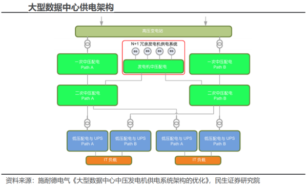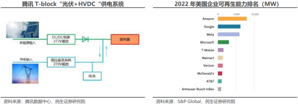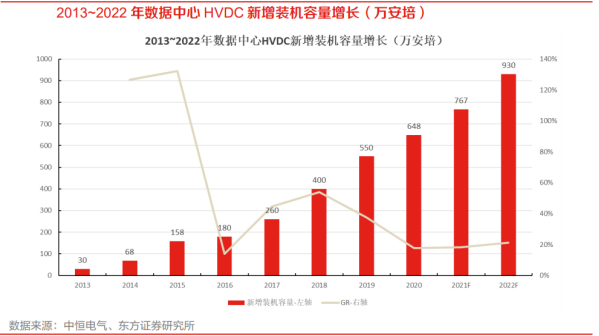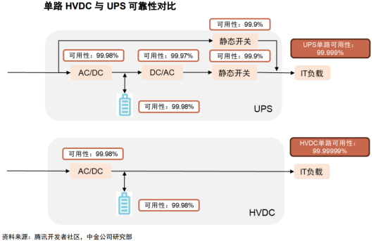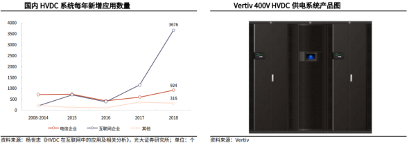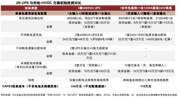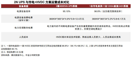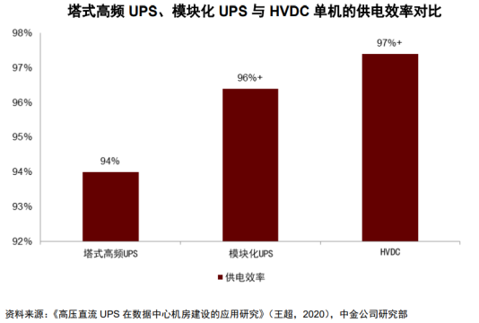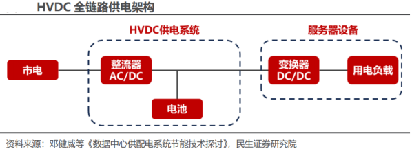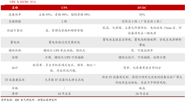高压直流系统(简称HVDC)主要由交流配电单元、整流柜、蓄电池、电池管理单元、直流配电单元、绝缘监测单元及监控模块组构成。其中,整流柜中包含多个串联的整流模块、属于HVDC的核心部件,在市电正常时整流模块将交流配电单元输出的380/400V交流电转换成240V高压直流,高压直流经直流配电单元给IT负载供电,同时也给蓄电池充电,在市电断电或质量不满足要求时、由蓄电池给IT负载供电。市电 HVDC双路供电是数据中心HVDC供电的重要解决方案。目前,数据中心采用高压直流解决方案,综合考虑安全性、可靠性和经济性的情况下,一般有HVDC单电源系统双路供电、HVDC双电源系统双路供电以及市电 HVDC双路供电三种方案,其中单电源系统双路供电存在单点故障(即末端IT负载的双路供电均来自一套HVDC电源系统),双电源系统双路供电投资相对较高,而市电 HVDC双路供电兼顾可靠性和经济性,是目前市场上较为主流的HVDC方案。2、HVDC起源于海外,国内方面也积极尝试推进HVDC海外:ABB收购Validus欲推广HVDC技术,但囿于安全性、设备成本等并未普及。二十一世纪初海外市场开始探讨数据中心HVDC供电,代表性厂商Validus创立于2006年、主要做数据中心的直流供电解决方案,与IBM、惠普和JP Morgan合作建立了三个试点数据中心,在2011年被ABB收购。海外多个国家都在探索HVDC的技术方案,也逐步在欧洲、日本、北美形成了300V到380V左右电压制式的行业标准,但整体来看,海外市场HVDC的发展一直相对缓慢。国内:电信运营商首推高压直流供电,腾讯、阿里巴巴等头部互联网厂商积极推进HVDC。国内电信运营商率先结合海内外经验推出了240V HVDC和336V HVDC的两款架构,其中240V由中国电信主推,336V由中国移动主推。而后腾讯、阿里等国内头部互联网厂商在降本增效需求的推动下开始在自建数据中心中有所应用。由于国内服务器电源主要采用220V电源输入,大部分可直接兼容240V HVDC系统,因此也成为主流的HVDC技术路线。目前国内市场HVDC方案市场份额仍然相对偏低,但整体的装机量在持续提升,考虑到相关行业统计较少,引用中恒电气官网数据,2022年国内HVDC新增装机容量为930万安培,相较于2013年已有大幅提升。HVDC供电方案相较于UPS供电方案的优势在于效率更高、可靠性更好、稳定性更佳,并且HVDC接入风光、氢燃料电池等可再生能源分布式发电系统更加方便,方便微电网建设或改造。效率:HVDC减少电力变换次数、可采用ECO模式,降低能量损耗、提升系统效率。根据《高压直流UPS在数据中心机房建设的应用研究》,在具体实践中,塔式高频UPS在50%以上负载率的情况下效率可达96%,但由于冗余设计、实际负载率在10%-40%,因此塔式高频UPS效率一般在94%左右,而模块化UPS由于具有模块智能休眠功能、供电效率可以达到96%以上,而HVDC系统省掉了逆变边界,并且同样采用模块化设计、具有智能休眠功能,供电效率在全负载范围内可达到97%以上。可靠性:HVDC拓扑结构简单、可靠性更高。首先从理论角度来看,HVDC的拓扑结构相比UPS的拓扑结构更简单,因此可发生故障的节点更少、可靠性更高。根据腾讯开发者社区的测算,通过对HVDC和UPS各核心节点的可靠性进行合理假设,最后测算出单路HVDC的可靠性略优于单路UPS。其次从具体实践结果来看,根据腾讯的统计,截至2023年11月腾讯数据中心已部署的UPS和HVDC占比分别为13%和87%,但在22年12月到23年11月期间,已部署UPS发生一级事件(通常涉及大规模的服务中断,影响到关键业务功能)61次,已部署HVDC发生一级事件仅5次,HVDC相比UPS的可靠性优势可见一斑。稳定性:节能模式下HVDC供电稳定性更佳。节能是当前数据中心建设的核心诉求之一,提升系统效率因此成为供配电环节的核心任务。UPS和HVDC系统的效率都是随着负载率的提升而上升,因此为提升实际工作效率,模块化UPS和HVDC系统都具备根据实时负载率调整电源模块工作状态的休眠功能。对比二者差异,如果出现系统负载率瞬时上升的情况,模块化UPS系统蓄电池向IT负载供电要经过逆变环节、需等待UPS启动休眠的电源模块,而HVDC系统中蓄电池直连母线,蓄电池能够快速向IT负载供电、保障供电的稳定性。新能源接入:HVDC系统方便接入新能源、构建微电网。HVDC系统能够直接接入光伏、风电、氢燃料电池等分布式可再生能源,能够降低风光、氢能等微电网的接入成本,提高功率转换效率和电能质量。我们主要从CAPEX和OPEX角度来分析UPS供电和HVDC供电方案的经济性。参考腾讯给出的UPS和HVDC的CAPEX对比,具体是选择2套400KVAUPS(功率为360kW)和一路360kW市电 一路360kW240V HVDC系统进行CAPEX(投资成本)和OPEX(运维成本)对比。CAPEX视角:2套400KVAUPS(功率为360kW,UPS功率因数约为0.9)的CAPEX明显高于一路360kW市电 一路360kW 240V HVDC系统,并且UPS的占比面积也比HVDC更大,会带来更高的土地购买或租赁费用以及土建成本。OPEX视角:相比UPS方案,市电 HVDC方案优势在于节约电费,因其系统效率相对更高、在供电过程中对于电费的浪费相对较少,并且电源设备散热所需空调费用相对更低;劣势在于HVDC渗透率相对较低、业内熟练运维人员较少,估计人员运维成本相对较高。