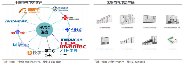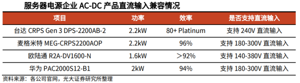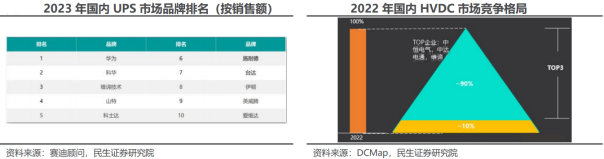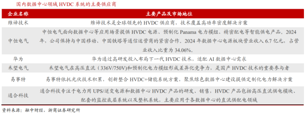 我国HVDC应用从通信网络开始,而后推广至互联网企业数据中心。2007年起,240V HVDC供电技术开始在我国通信网络和数据中心得到广泛实际应用,至今为止已经出台了多项行业标准及国家标准。最初HVDC在传统通信运营商(中国电信、中国移动、中国联通)的通信网络中应用较多,主要是因为通信设备通常采用-48V直流供电,运营商也因此对直流电系统相对熟悉,因此HVDC技术得到了较为快速的应用。后期随着通信运营商成功应用HVDC并取得效率提升的经验,以BAT(百度、阿里巴巴、腾讯)为主的互联网运营商在大规模建设数据中心时,对HVDC应用的需求也快速提升。海外数据中心HVDC应用未来有望逐步推广。随着AI数据中心功率需求提升,海外下一代AI数据中心有望采用±400V的HVDC供电方案。Vertiv拥有NetSure系列400V HVDC电源解决方案,其效率可以达到96.5%及以上。关于HVDC替代交流UPS后对服务器机架中AC-DC电源的影响:从现有的头部服务器电源企业的AC-DC电源产品来看,大部分都支持240V直流输入,因此相关人士认为,在当前我国数据中心HVDC供电系统输出电压以240V为主的情况下,HVDC的应用对AC-DC服务器电源的应用规模影响微乎其微。展望未来,随着HVDC向更高电压等级发展(如300V以上),现有的AC-DC服务器电源将难以兼容,这或将使得服务器电源由AC-DC向DC-DC进行发展。数据中心UPS市场规模稳步提升,HVDC仍有较大成长空间。根据Global Growth Insights,2023年全球数据中心UPS市场规模约为45.25亿美元,并预计2024年和2032年将分别达到48.53亿美元和85.02亿美元,24-32年CAGR为7.26%。根据赛迪顾问,2023年中国UPS市场规模为97.7亿元,同比增长6.7%,并预计2026年将达到127.3亿元,23-26年CAGR为9.22%。随着AI快速发展,数据中心建设将持续加速,有望推动全球数据中心供电系统市场规模持续提升。当前在AI数据中心中,交流UPS仍是主要的供电方案,但HVDC应用也在逐渐加速;根据国企网援引的数据,在2023年运营商和互联网交直流电源应用的市场中,高压直流占总容量比例约10%,但其2021-2023年的年均增长率为33%,呈现快速发展的趋势。UPS 厂商均有亮点,HVDC行业集中度较高。国内UPS市场方面,据赛迪顾问,2023年华为、科华和维谛技术占据市场前三位置,合计市场份额超过40%, 其余厂商各自布局细分领域,山特主攻中小功率机,科士达凭借高端中大功率UPS快速增长,爱维达则依靠金融、电信等领域实现突破。国内HVDC方面,据DC Map,2022年中恒、中达和维谛位列市场前三名,合计市场份额高达90%,行业集中度较高。中恒电气深耕直流方案,在行业中享有较高地位。作为数据中心HVDC技术方案的先行者,公司牵头制定了《信息通信用240V/336V 直流供电系统技术要求和试验方法》国家标准,拥有超过10000MW的装机容量,能够支持单机柜600kW的负载,正持续探索高可靠性、集中式架构下的750V直流解决方案与产品,以满足未来数据中心更高效、更环保的需求。公司凭优秀技术水平为各大数据中心提供定制HVDC直流配电系统,服务于阿里巴巴、腾讯、字节跳动等知名企业,先后签订“百度云计算中心项目之高压直流供应工程项目”、“2021年腾讯高压直流及综合配电柜采购项目以及T-Trian电源集采项目”和“山东移动数据中心直流不间断电源项目”等。禾望电气拥有完整的大功率电力电子装置及监控系统的自主开发及研发实力与测试平台。公司专注于新能源和电气传动领域,提供0.75-22400kW低压变频、 8-136MVA中压变频传动解决方案,可广泛应用于冶金、石油石化、矿山机械、港口起重、分布式能源发电、大型试验测试平台、海洋装备、纺织、化工、水泥、市政及其它各种工业应用场合。科华数据在国内UPS市场处于领先地位。公司电能业务以高端电源为核心,涵盖核级、工业、通信等领域,旗下产品功率范围覆盖0.5kVA-1200kVA,明星产品S³锂电一体化UPS是集UPS、锂电模块和配电于一体,具有安全可靠、灵活智能、运维极简的特点。公司以技术创新提升产品竞争力,模块化UPS方案先后应用于杭州亚运会、中国科学院子午工程二期、科威特水电局等海内外项目,下游客户包括三大运营商、大型国有银行、大型证券交易所、腾讯等。