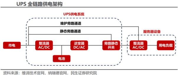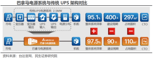 UPS系统是保证数据中心供电连续性和可靠性的关键。一个典型的数据中心供电系统,包括中压配电、变压器、低压配电、UPS、末端配电以及发电机等设备。其中UPS的主要作用是:提供后备时间:在市电电源中断、发电机启动之前,由自带的蓄电池或者飞轮放电,为所承载的负载提供持续稳定的电力供应;电网净化:对市电的电源污染问题进行处理,具备稳压、稳频、滤波、抗电磁和射频干扰、防电压浪涌等功能。目前数据中心供配电系统以UPS系统为主。随着数据中心规模的持续扩大,UPS也在不断进行迭代升级,早期故障点多、效率低、扩展困难等问题得以改善。目前大多数UPS系统采用模块化设计,对关键部件采用全冗余设计,业内平均效率水平达到96%,华为的UPS5000-H更是可以达到99.1%,接近无损耗。一般来说,UPS拥有5种工作模式:市电逆变模式:在市电正常情况下,市电通过整流器由交流电变换为直流电,供给逆变器的同时为电池充电,逆变器将直流电变换为交流电,为服务器设备供电。电池模式:在市电异常或断电情况下,由电池输出,经DC/DC升压器后供给逆变器,再由逆变器输出交流电为服务器设备供电。旁路模式:UPS在发生异常时进行自动切换,市电由静态旁路通道,经滤波后直接为服务器设备供电,此时逆变器处于关机状态,不具备电池后备能力。维护模式:在进行UPS维护时,市电由维护旁路通道直接为服务器设备供电,不对用电环境进行处理,此时整流器和逆变器处于关机状态。ECO模式(UPS运行的经济模式):在市电输入处于预设电压和频率范围内时,UPS通过静态旁路通道为服务器设备供电,由于不存在电流转换导致效率损耗的情况,整体用电效率有所提高,此时整流器和逆变器始终处于热备用状态。若超出设定范围,UPS将切换至市电逆变模式或电池模式为服务器设备供电。HVDC系统在多个方面表现优于UPS系统,具有高效节能、稳定可靠、灵活拓展、节约空间、降低成本等优势。目前已有数据中心采用HVDC(高压直流输电)系统。国内方面,最早由中国电信推进使用HVDC,目前已成功扩展至多个领域,主要应用有阿里巴巴的巴拿马电源、腾讯的第三代数据中心T-MDC和第四代数据中心T-block等;国外方面,Intel、微软、Meta等公司也已采用400V直流供电系统。相较于UPS,HVDC取消了逆变器环节,供电线路更加简单。当市电正常时,市电经由整流器转换为直流电后直接向服务器设备供电,同时为电池充电;当市电发生故障时,由电池直接向服务器设备供电。3、新一代HVDC系统革新,把握数据中心电源未来方向新一代数据中心电源将集成更多设备功能。阿里巴巴的巴拿马电源彻底革新了传统IDC的供电架构,其创新之处在于直接从中压交流电接入并输送至列头柜,摒弃传统架构中从引入中压电到最终输出直流电过程中所涉及的大量繁琐中间环节与设备,简化了供电传输方式,相较于传统UPS而言,巴拿马电源的设备数量和安装工程量减少了40%,安装空间减少了50%,总建置成本减少了40%-60%。百度于2024年数据中心标准大会上推出的“瀚海”直流电源也同样采用一体化设计。未来,算力激增使得AI芯片数量增加,对数据中心空间利用的要求会越来越高,提升供电系统集成度将会成为趋势。新一代数据中心电源将输出更高电压。目前普遍采用的HVDC系统的输出电压为240V/336V,但是随着AI芯片性能不断攀升、数量不断增加,单台服务器功耗激增,以英伟达GB200 NVL72为例,机架功率便达到120kw,已经远远超过传统服务器,叠加超大算力集群建设,数据中心整体功耗水平急剧上升,传统方案难以保证效率。在这种情况下,数据中心供电系统的高电压输出成为趋势。百度2024年推出的“瀚海”直流电源配备了750V输出柜,支持单机柜100kw,效率提升2%-4%;台达最新推出的10kV供电系统DPSST系列最高输出电压更是达到1000V,整机效率达到98%以上。清洁能源正逐渐成为数据中心供电新方向。目前国内外已有多数厂商为数据中心寻求清洁能源:腾讯:2017年,腾讯第四代数据中心T-block问世,供电系统采用“光伏 HVDC”的方案,实际使用中,当日照辐射在800W/m2左右时,光伏DC输出便足以满足负载全部电力需求,且由于不存在整流器AC/DC转换,整体效率进一步提高,PUE小于1.10;微软:2021年便首次使用氢能燃料电池向数据中心供电;亚马逊:目前已使用风电、光伏等新能源为数据中心供电,同时移除UPS,转而采用集成于机架的小电池组来提升能量转换效率;谷歌、Meta等:正探索核能、地热能等清洁能源的应用条件。