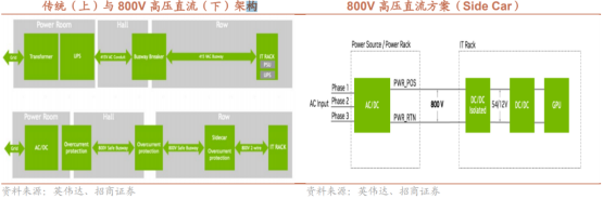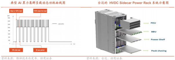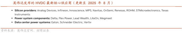 海外的HVDC供电是一个系统,里面包含PDU、BBU、Power Shelf和超容。引入超容:传统数据中心上线运行以后,负载相对比较平稳,很少有极端情况负载波峰或谷底出现,而智算中心的负载运行特点是不断进行训练任务来进行高速运算,当它开始训练任务时,负载将会迅速上升到比较高的功耗值,甚至会达到负载的极限值,而等到这次训练任务结束以后,它的负载又会迅速下降,降到最低值。这种脉冲式功率的波动对应的将是前面输电线路中的电流的快速波动,而一个瞬时的大电流将使得前面的电气设备出现“烧坏”的现象。所以,引入了超容,通过超容来削掉峰值功率,保护整体供电线路。引入BBU:BBU是AI服务器中提供备用电源的组件,旨在应对电力中断或波动,确保系统在主电源失效时能够继续运行。AI服务器,尤其是用于训练大模型或实时推理的服务器,对连续性要求极高。如果电源中断,即使是短暂的,也可能导致数据丢失、模型训练中断或硬件损坏,这在数据中心环境中尤为致命。BBU通过集成在服务器硬件中,提供微秒级的电源切换能力。PDU也被嵌入到了Sidecar Power Rack里面。在数据中心中的PDU一般承担着分配高压直流电、管理电压、监控电力使用、提供故障保护以及确保安全的关键功能。从目前各厂家提供的方案看,一个Sidecar Power Rack里也集成了PDU,使得电源厂商的可为空间进一步增加。海外Sidecar方案与国内传统的HVDC方案对比:国内并未引入超容,国内当前由于使用的芯片性能相较于海外有一定差距,解决“脉冲式功率”问题的必要性不强;国内HVDC模块转化的电压较小,海外数据为800Vdc,国内为240/336Vdc;国内的HVDC系统后面,一般还需配一个列头柜,需要占用一个IT机柜的位置,海外直接融合PDU到了Sidecar里面。柜外供电的核心在于给GPU安全可靠供电,目前英伟达和CSP话语权最强。当英伟达GPU开始升级时,考虑到供电升级的影响,会找一些产业链公司做预研,产品放量时这些公司也会进入供应链短名单。但由于CSP是最终的采购方,其也会在短名单里进一步遴选供应商。由于目前产品尚在预研阶段,相关人士认为是否在短名单或者拿到预研需求是当下重点关注变量。根据英伟达官方文档最新的信息,目前合作的供应商主要有:半导体供应商:Analog Devices(亚德诺半导体)、Infineon(英飞凌)、Innoscience(英诺赛科)、MPS(芯源)、Navitas(纳威半导体)、OnSemi(安森美)、Renesas(瑞萨电子)、ROHM(罗姆)、STMicroelectronics(意法半导体)、TexasInstruments(德州仪器)。电源系统供应商:Delta(台达电子)、Flex Power(伟创力电源)、Lead Wealth(比亚迪电子子公司)、LiteOn(光宝科技)、Megmeet(麦格米特)数据中心供电供应商:Eaton(伊顿)、Schneider Electric(施耐德电气)、Vertiv(维谛技术)电源厂商推HVDC相对积极,供电厂商推HVDC进度也在加速。由于到了HVDC供电阶段,柜外的供电和柜内服务器电源的玩家界定开始变的模糊。在之前UPS供电阶段,柜外用UPS供电,厂商为伊顿、维谛、施耐德;柜内为台达、光宝、麦格米特供服务器电源。到了HVDC Sidecar Power Rack阶段,柜内的服务器电源玩家有机会切到柜外,或有可能改变柜外供电格局,导致这些玩家相对积极。目前台达、光宝、麦米均已看到其发布的HVDC Sidecar Power Rack产品。柜外老牌供电厂商面临格局重塑风险,或找中国企业代工合作研发产品。由于27年预计大规模上HVDC,研发产品的周期在缩短,过去,中国在新能源、通信等环节积累了一批有较强研发实力的电力电子公司,这些公司已经具备特定产品从0到1的能力。当行业变化越快,研发的速度,响应的速度,工程师的综合水平这类因素将开始定价,中国公司优质工程师的团队将助力其快速帮助北美客户开发产品。目前,产业链反馈,已有部分公司接到海外HVDC协助研发或者代工需求,这些公司是隐藏在英伟达白名单之下的受益者。国内部分厂商,也仍有直接导入的机会。英伟达的白名单是动态的,今年8月国产半导体厂商英诺赛科就导入其白名单。由于距离rubin ultra NVL 576放量还有2年时间,国内有部分公司过去积淀了较强的电力电子技术,有些新能源公司也在海外积累了本地化渠道、售后及配电解决方案能力,这类公司有可能弯道超车,在未来拿下客户需求,导入英伟达短名单。